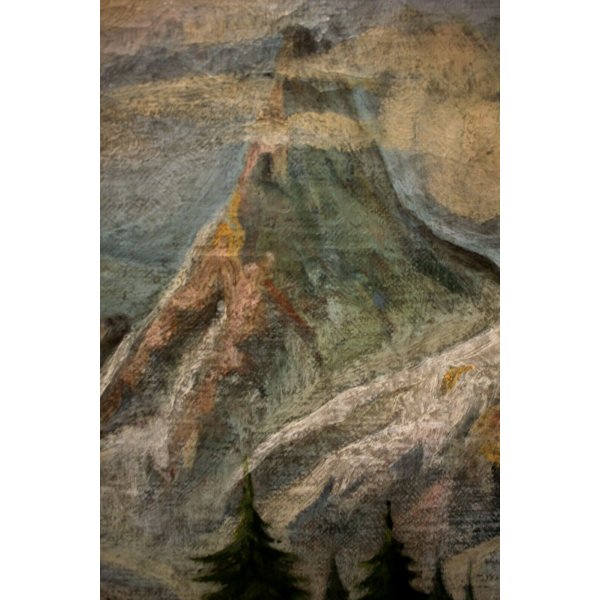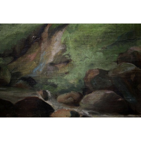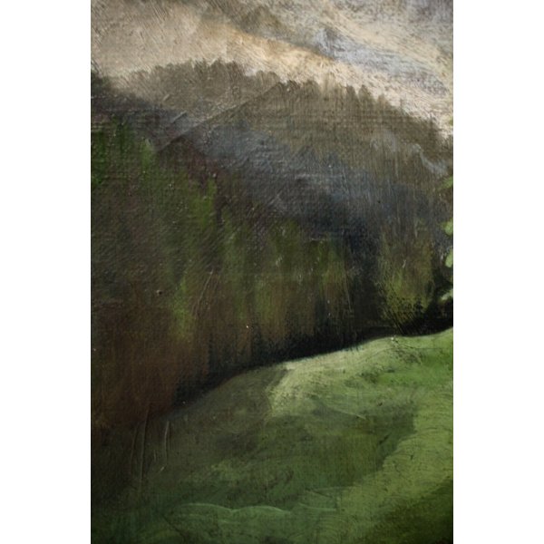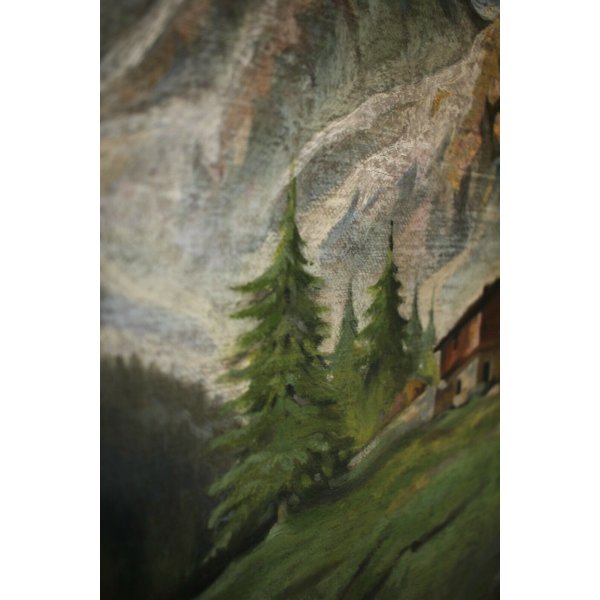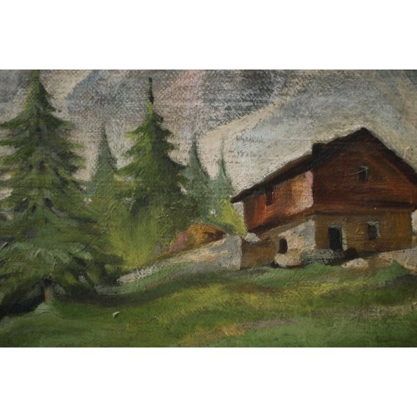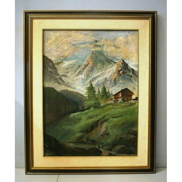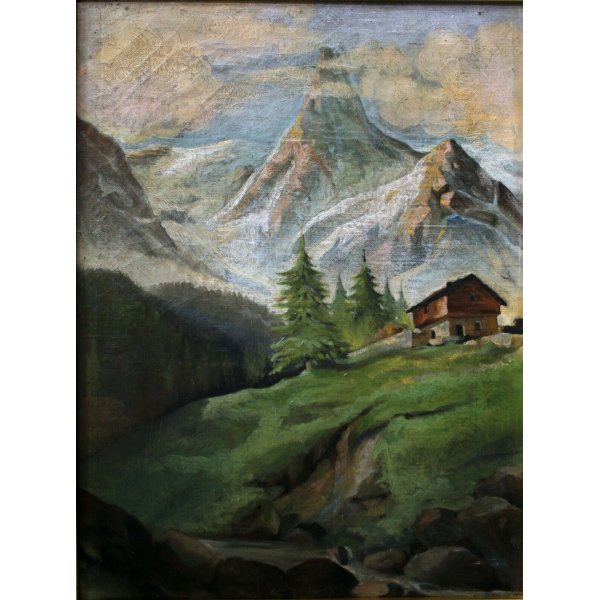 Meraviglioso paesaggio alpino con il Cervino sullo sfondo tra le nuvole, una baita ed un corso d'acqua in primo piano. Un dipinto Naif dalla composizione semplice ma di grande immediatezza e profondità. L'opera non presenta firma ed è contenuta in una cornice lignea con passepartout in tela grezza non coeva.