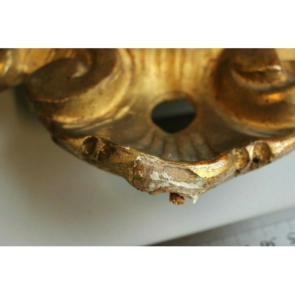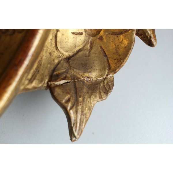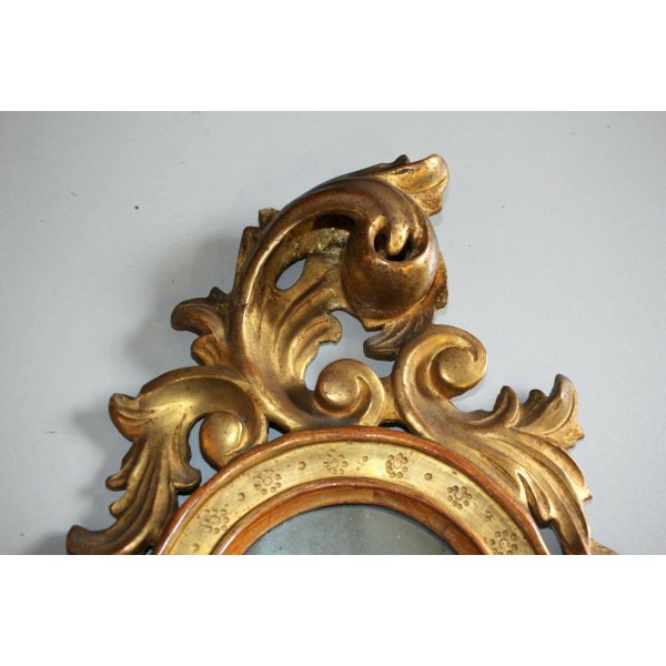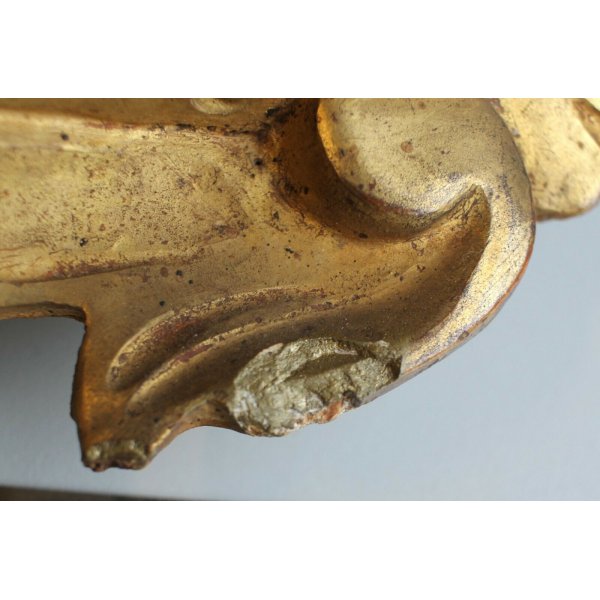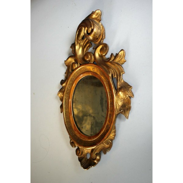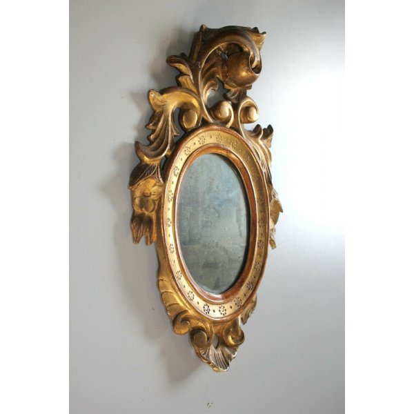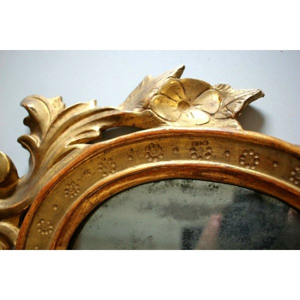 Condizioni: In buone condizioni data l'epoca, la cornice presenta normali, leggeri segni del tempo e di utilizzo. I piccoli aloni grigi sullo specchio, sono dovuti al tempo, sono da considerarsi un pregio e non un difetto. Segnalo una spaccatura netta longitudinale ben incollata su di una foglia sul lato destro e un mancanza di gessatura e doratura sulla punta inferiore. Tutto visibile dalle foto allegate all'inserzione.