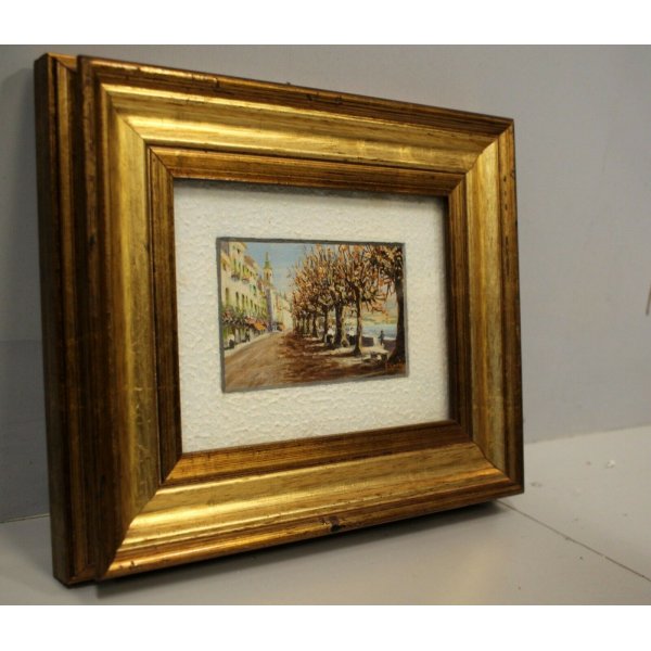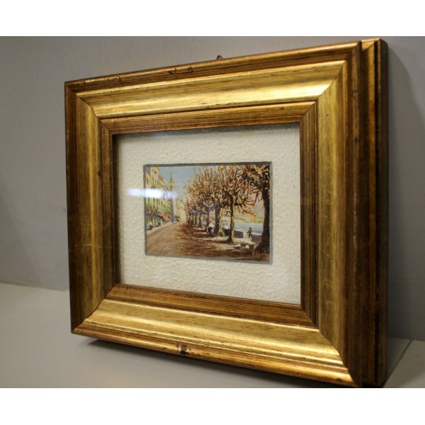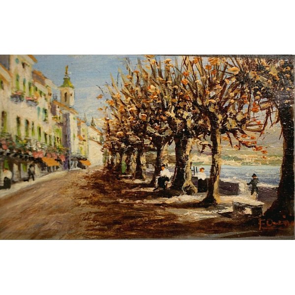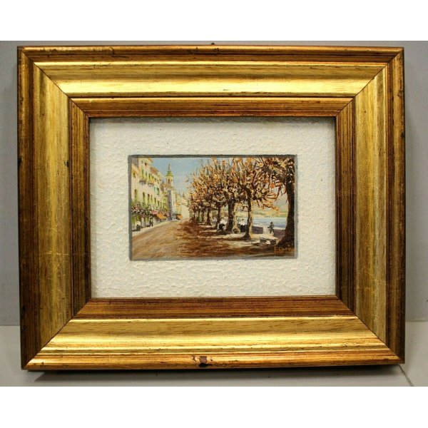 Stupendo, piccolo dipinto olio su faesite, rappresentante una veduta autunnale, del lungolago alberato di Belgirate. In primo piano figure di viandanti che si riparano dal sole sulle panchine. Il dipinto è firmato in basso a destra "F. Orsini" ed è contenuto in una elegante cornice dorata coeva e completa di vetro protettivo.