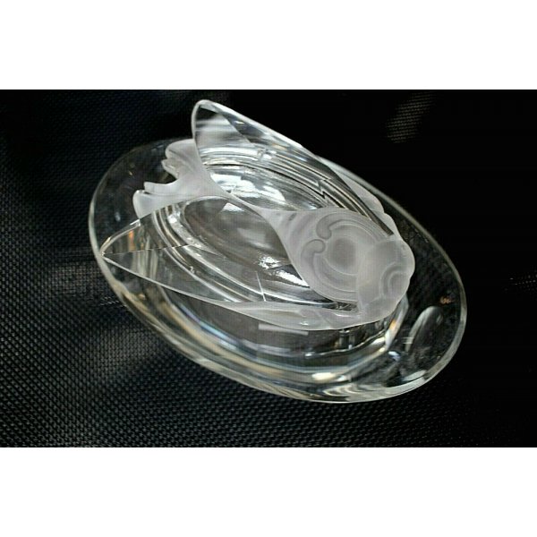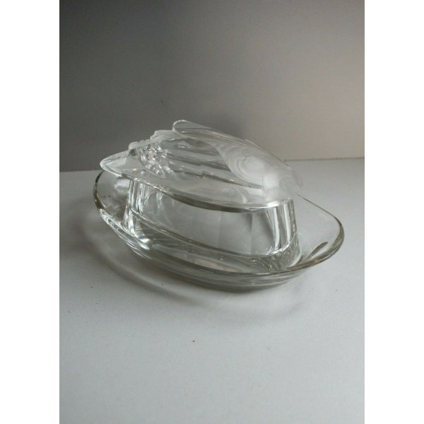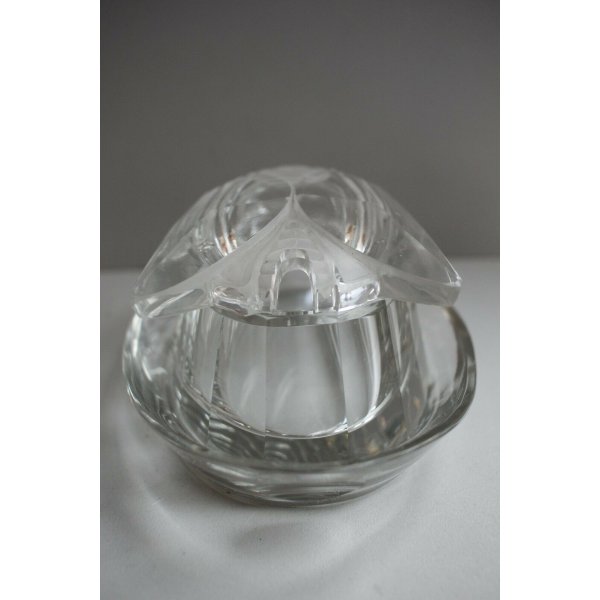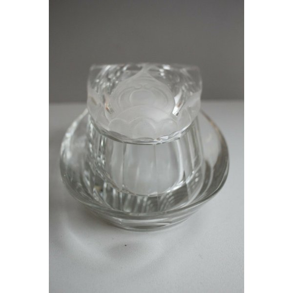 Stupenda e rara scatola Vintage composta da tre parti: piattino, bowl e coperchio in forma di mosca, Art Decò, realizzata in vetro molato acidato. Per design e fattura riferibile a René Lalique, progettata tra il 1920-1945. I disegni di Lalique si ispiravano spesso alla natura e questa scatola in vetro con motivo a mosca è rappresentativa di questa ispirazione. Questo e una straordinaria gamma di altri oggetti in vetro decorativi alla moda sono stati utilizzati nelle case di tutta Europa e oltre, realizzando così il sogno di René Lalique di rendere disponibili a tutti oggetti in vetro ben progettati e convenienti. La maggior parte dei suoi oggetti in vetro ha una caratteristica finitura superficiale smerigliata (incisa con acido). Che si tratti di pezzi unici o di produzione, l'azienda René Lalique et Cie era rinomata per la sua eccellente qualità e gli elevati standard artistici.