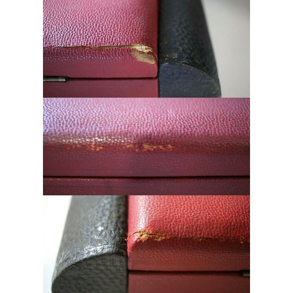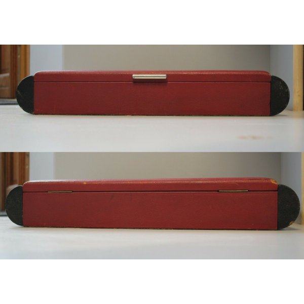 Condizioni: Scatola in legno con rivestimento il pelle, usata, presenta leggere spelature, segni del tempo e di utilizzo sui profili e internamente sul rivestimento vicino alle cerniere, un leggero craclè sulla verniciatura della roulette, un mazzo di carte è stato aperto, i blocchetti segna punti sono nuovi, lievissimo alone rosso sulla scacchiera, particolari che nell'insieme non compromettono la bellezza del set e ne testimoniano l'originalità.