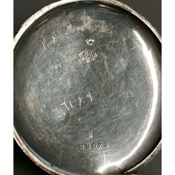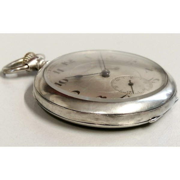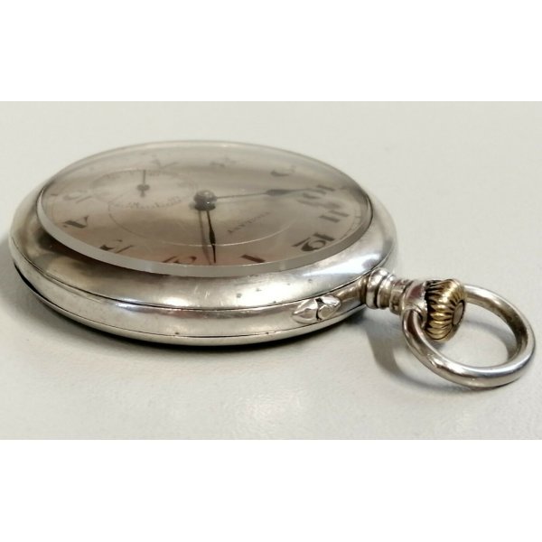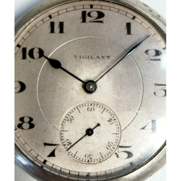 Delizioso orologio da tasca anni 40, originale d'epoca, Vigilant, di ottima manifattura orologiaia, meccanico a carica manuale, funzionante, quadrante grigio chiaro con numeri arabi e lunetta dei secondi alle ore 6, cassa con fondello decorato in argento 800