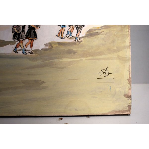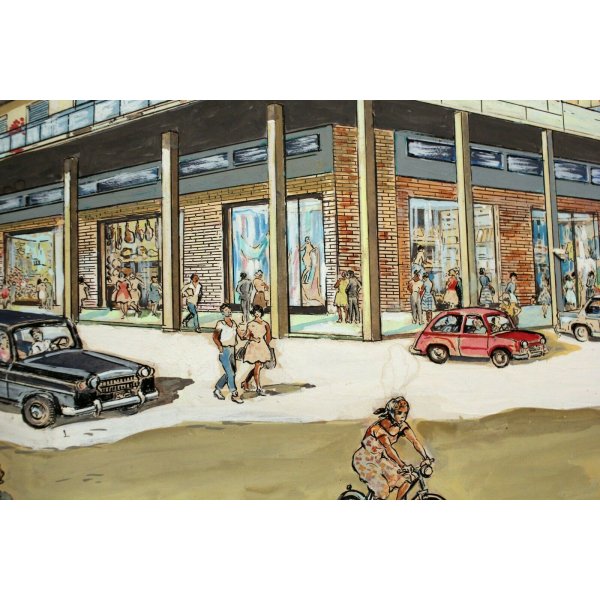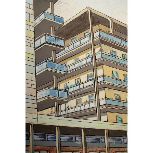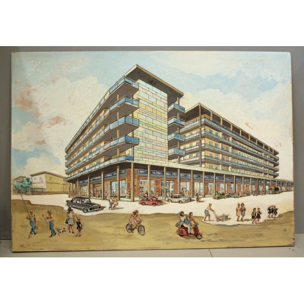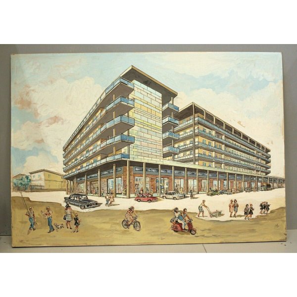 Stupenda rappresentazione, disegno, schizzo prospettico pittorico, realizzato a tempera su carta applicata a cartone pressato, opera di Alessandro Colla, artista illustratore capace di far immaginare la vita di chi abiterà la città del futuro. Lo stile di rappresentazione, il disegno e il formato, sono una testimonianza del metodo utilizzato negli anni '50/60 per la presentazione del progetto architettonico/edile alla committenza. Metodo paragonabile all'attuale "rendering" processo di resa che per mezzo della computer grafica trasforma un disegno in una scena tridimensionale completa di texture, materiali e figure. Notevole la correzione prospettica attuata dall'artista: per una visione corretta dell'opera si consiglia di guardarla dal basso verso l'alto. Firma in basso a destra con un monogramma "AC". Il palazzo rappresentato è stato costruito all'angolo tra Via Vittorio Veneto e Via Monte Zeda, nella città di Arona.