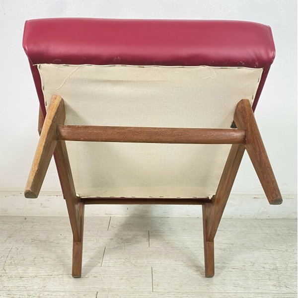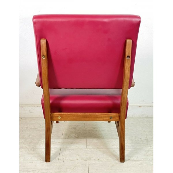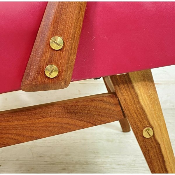 Fantastica sedia/poltrona di design vintage Danese degli anni 70 in legno e sky bordeaux con viti a taglio in ottone