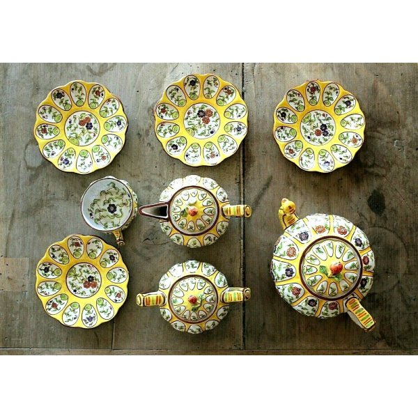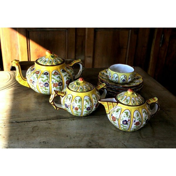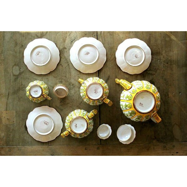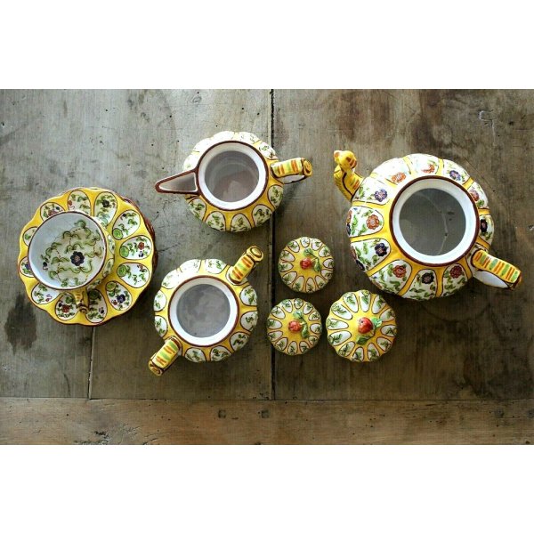 Meraviglioso servizio da te in ceramica bianca costolata con decoro policromo a fiori, su sfondo giallo, la presa dei coperchi è modellata in forma di frutto con ramo e foglie. Il set è composto da: 1 Teiera,1 Lattiera, 1 zuccheriera, 4 piattini, 1 tazzina. Servizio antico, usato presenta leggeri segni del tempo, piccole cips nello smalto poco visibili nell'insieme, non ne compromettono la bellezza.Tutto visibile dalle foto allegate all'inserzione. Marchio di attribuzione sul fondo "AD" Alba Docilia.