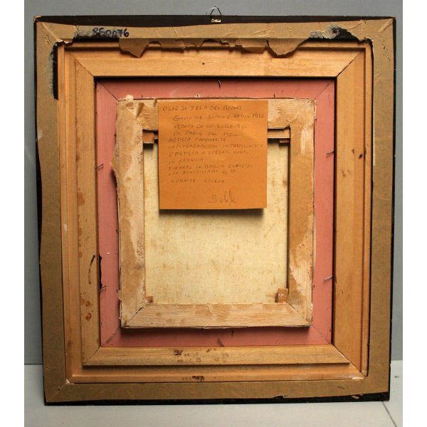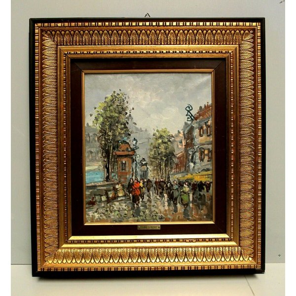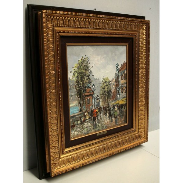 Stupendo dipinto olio su tela, una veduta di strada Parigina con viandanti in abiti invernali negli anni '70. Opera presenta inciso su targhetta metallica applicata frontalmente sulla cornice "Giulio de Simone" e al retro dove è presente un cartiglio con titolo e una breve descrizione del dipinto. L'opera di notevole sintesi è realizzata con pennellate rapide, brevi e un cromatismo vario comunicativo che traduce le sensazioni in significative espressioni poetiche. Giulio De Simone (1936) quotato e presente in asta. L'opera è contenuta in una importante cornice con passepartout ligneo, riccamente ornata con tema naturale in folglie d'acanto, dorata che ne aumenta la luminosità e la profondità.