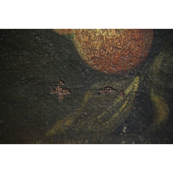 Antico dipinto olio su tela con intelaiatura originale fissata con chiodi, raffigurante una natura morta di notevole composizione, armoniosa ed equilibrata con un vaso di fiori e abbondanza di frutta sparsa su tavoli di diversa altezza e diversa fattura, un vaso con coperchio elegantemente decorato. La composizione ha uno sfondo scuro-rossastro, per far risaltare al meglio le cromie, la pennellata decisa spumeggiante, definisce con immediatezza le corolle variopinte e la frutta matura. Il dipinto è antico presenta segni del tempo, piccoli punti di caduta del film pittorico, un piccolo foro in alto sui frutti rossi. La tela è un po' lasca alla base, al retro sono visibili pregressi interventi di restauro. Tutto valutabile dalle foto allegate all'inserzione.