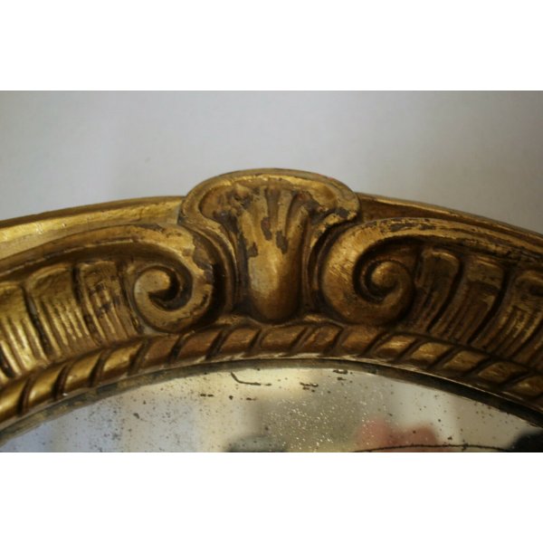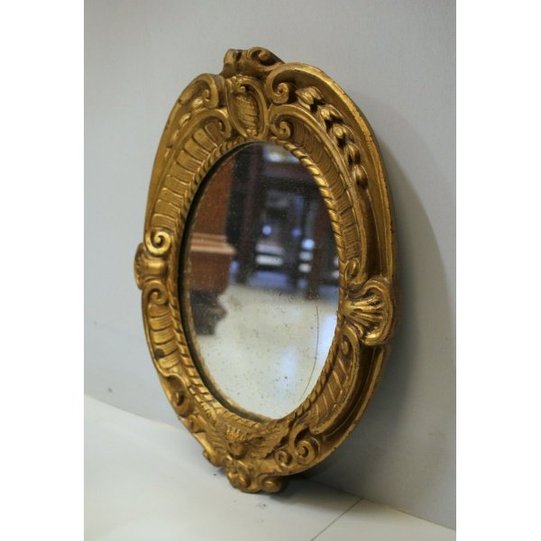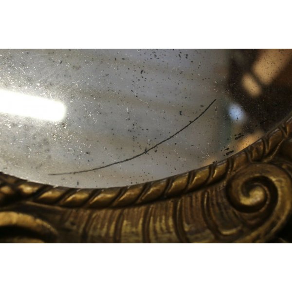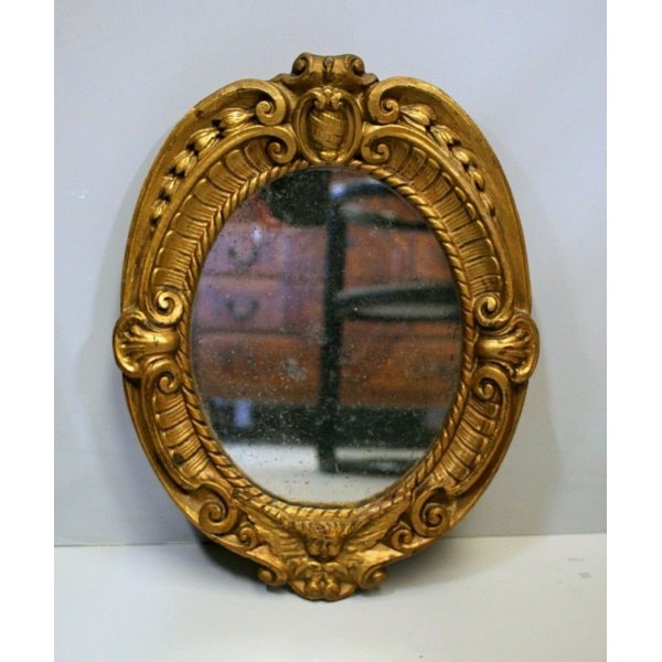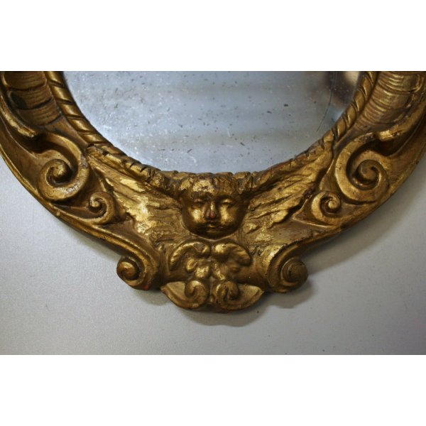 Meravigliosa antica specchiera ovale in legno dorato con cimasa finemente intagliata, la cornice delicatamente incisa a motivi floreali riccioli e volute e un putto nella parte bassa, completa di specchio coevo. Presenta piccole usure e restauri pregressi. Molto versatile, adatta ad ogni ambiente, dall'ingresso alla stanza da letto, al bagno o al soggiorno.
