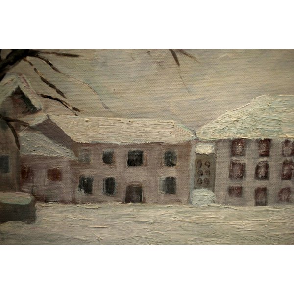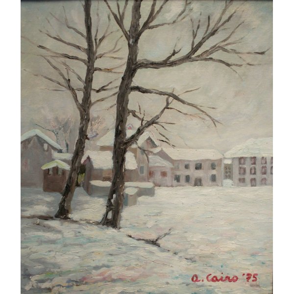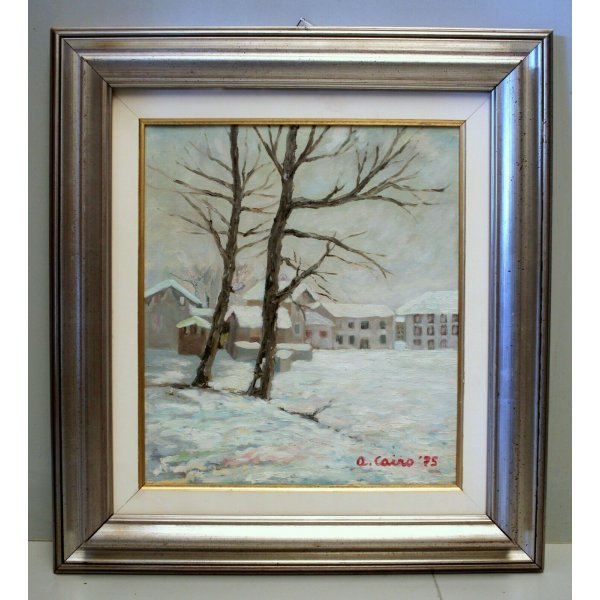 Stupendo dipinto olio su tavola, firmato e datato in basso a destra "A. Cairo 75" rappresentante un paesaggio cittadino invernale innevato, forse Pallanza. Infinite sfumature tonali, notevole il contrasto tra gli arbusti scuri, bruni in primo piano e il cielo perlaceo, i rosa sporchi dei muri delle case sullo sfondo. L'opera è contenuta in una cornice argentata con passepartout ligneo coeva.