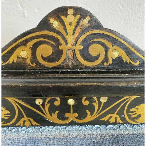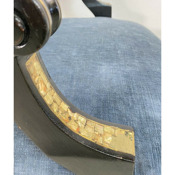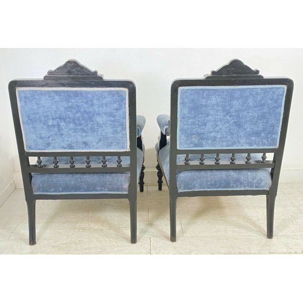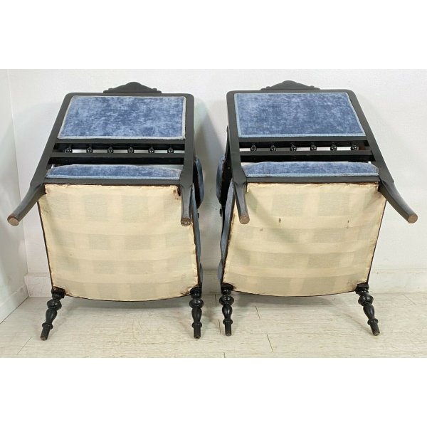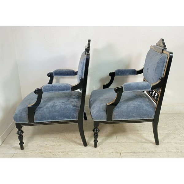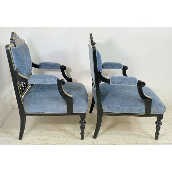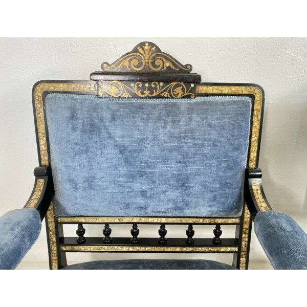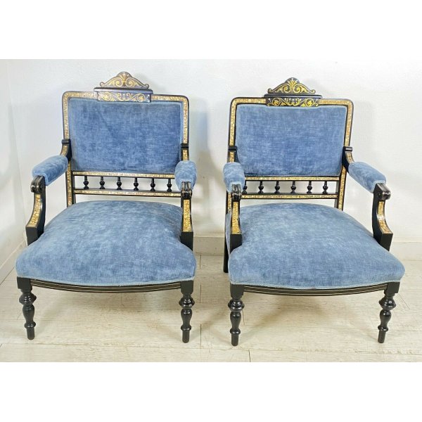 Fantastica coppia di poltrone dei primi del 1900 in legno massello ebanizzato e intarsiato in ottone e decorato in madreperla