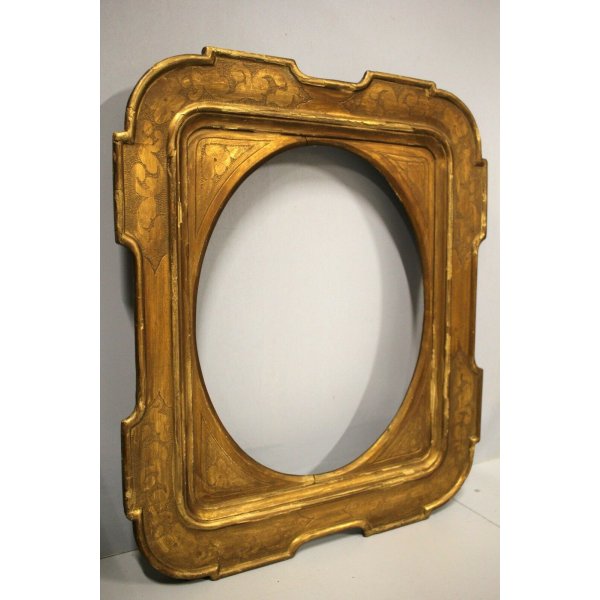 Stupenda cornice a vassoio con sagoma mistilinea, impreziosita da decoro bulinato in forma di fiori e foglie, dorata. Manufatto del XIX sec con luce interna ovale, utilizzabile anche come specchio, specchiera.