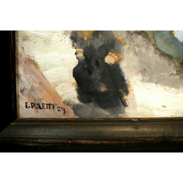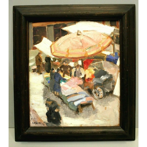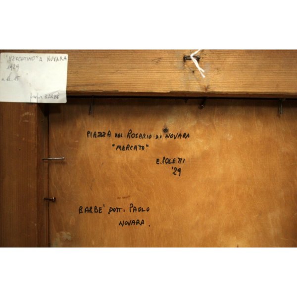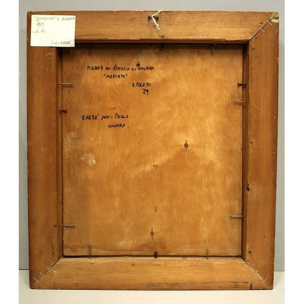 Stupendo dipinto, olio su tavola, firmato in basso a sinistra "E. Poletti 29" rappresentante uno scorcio di mercato novarese, titolato sul retro: Piazza del Rosario di Novara "Mercato" e firmato E.Poletti '29 con dedica: (Barbé dott. Paolo, Novara). Le opere di Edmondo Poletti sono di grande immediatezza, capaci di trasmettere la sensazione di tranquilla quotidianità delle persone e dei loro lavori, grazie all'uso sapiente degli accostamenti cromatici e alla sua pennellata, che risente dell' influenza macchiaiola, corposa e rapida nel definire i volumi di forme e figure. Il dipinto è contenuto in una semplice cornice lignea color marrone. Edmondo Poletti (Novara1908-Ghemme1979) è noto artista novarese quotato e presente in asta.