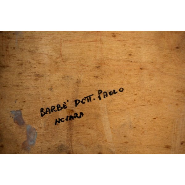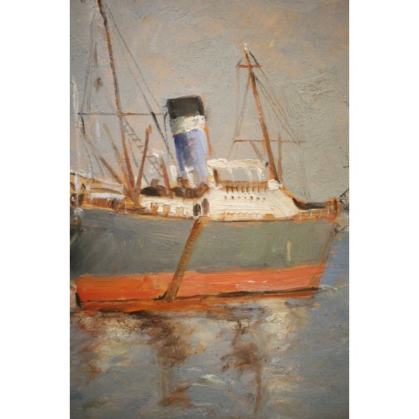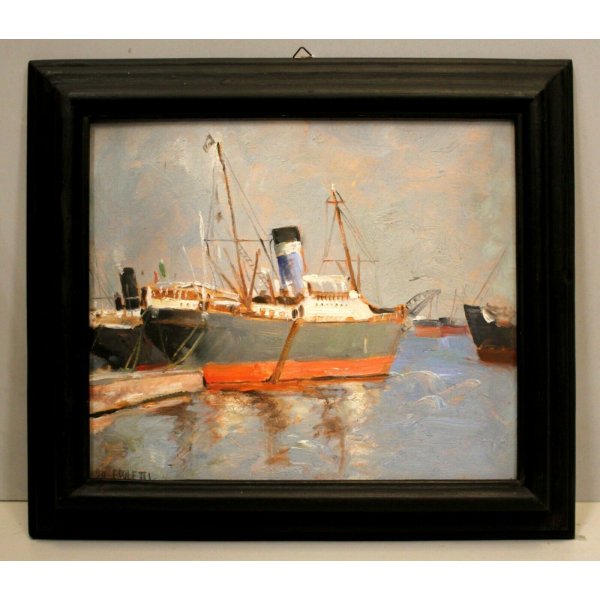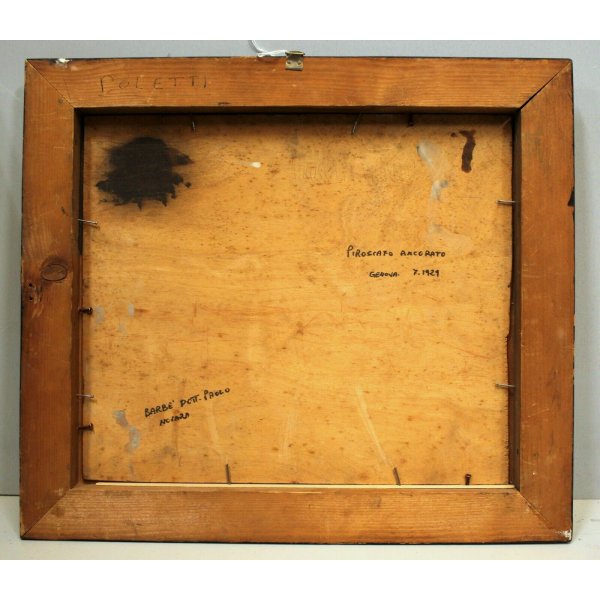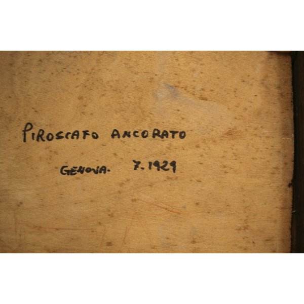 Magnifico dipinto, olio su tavola, firmato in basso a sinistra "E. Poletti '29" rappresentante un paesaggio marino, titolato al retro "Piroscafo ancorato, Genova 7-1929" e firmato E.Poletti '29 con dedica: (Barbé dott. Paolo, Novara). Le opere di Edmondo Poletti sono di grande immediatezza, capaci di trasmettere una sensazione di tranquilla quotidianità grazie all'uso sapiente degli accostamenti cromatici e alla sua pennellata, che risente dell' influenza macchiaiola, corposa e rapida nel definire i volumi di forme e figure. Il dipinto è contenuto in una semplice cornice lignea dipinta color marrone opaco. Edmondo Poletti (Novara1908-Ghemme1979) è noto un artista novarese quotato e presente in asta.