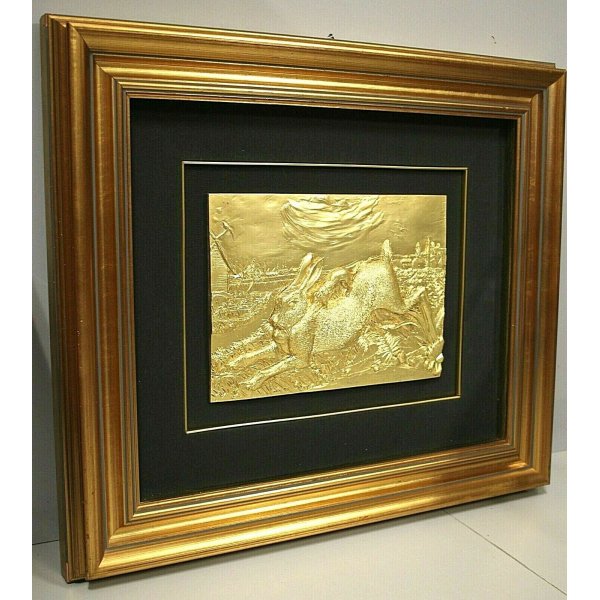 Spettacolare scultura, bassorilievo, tributo a Ligabue molto raro in edizione limitata a 499 esemplari. Bassorilievo con forma rettangolare contenuto in una cornice legnea dorata, supporto rivestito in tessuto verde scuro. Sul retro è presente un cartiglio con informazioni sull'opera: Certificato di autenticità e unicità - Specimen n° 153/499 - Size mm. 250x350 - Silver 1000/1000 (R) - Gold 1000/1000 (R) - Serie the greate master - Title: "Lepre con donnola" - Arte "In" Executor - omage to: Ligabue (firmata e numerata sull'opera) Al retro, in una busta, è presente il documento notarile che ne certifica l'autenticità.