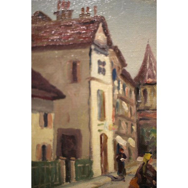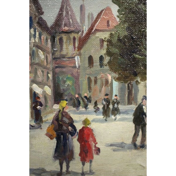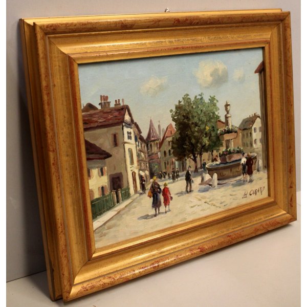 Stupendo dipinto olio su tela, rappresentante la veduta di una piazza, una scena di vita quotidiana in un antico borgo con figure di viandanti (Italia, nord Europa?). Vari personaggi sullo sfondo che camminano, chiacchierano, dietro di loro la magnifica vista della città con un grande albero dalla chioma verdeggiante, in primo piano un bimbo gioca con l'acqua della fontana decorata con fiori dai colori vivaci. Il dipinto di ispirazione impressionista, firmato in basso a destra "H. Carardi" (?) Talentuoso artista del quale non sono riuscita a trovare la biografia. Opera contenuta in una cornice lignea dorata.