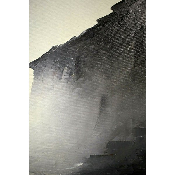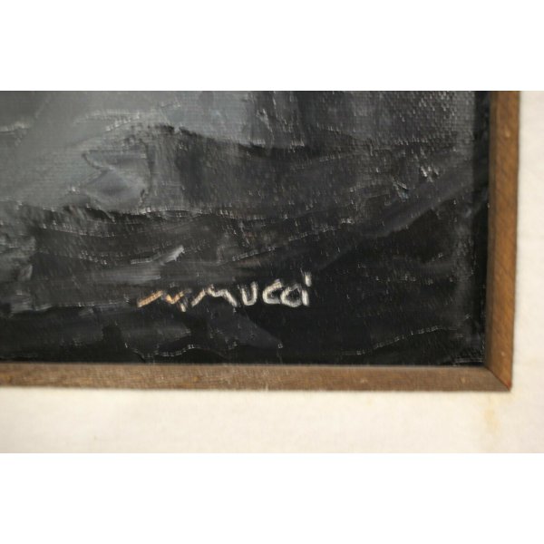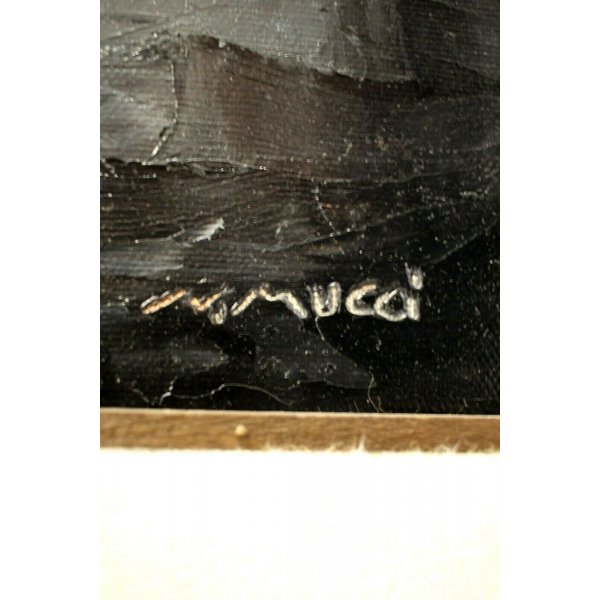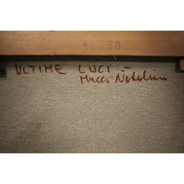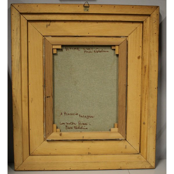 Stupendo dipinto olio su tela rappresentante un paesaggio invernale, della montagna intorno a Marliana (PT) Toscana. Il sole è abbagliante il contrasto chiaroscurale tra il cielo e il casolare in ombra è netto, una nebbia radente al terreno descrive un paesaggio dall' atmostera tempestosa, un'uomo sta raggiungento la sua meta, il sole sta calando. L'opera genera in chi lo osserva un senso di freddo e di silenzio assoluto. Il dipinto è firmato in basso a destra con la coda del pennello,"N. Mucci" artista quotato e presente in asta. Al verso sono presenti una dedica, il titolo dell'opera e la firma dell'autore: "Ultime luci". Opera contenuta in una cornice lignea color bronzo con passepartout in morbido panno bianco.
