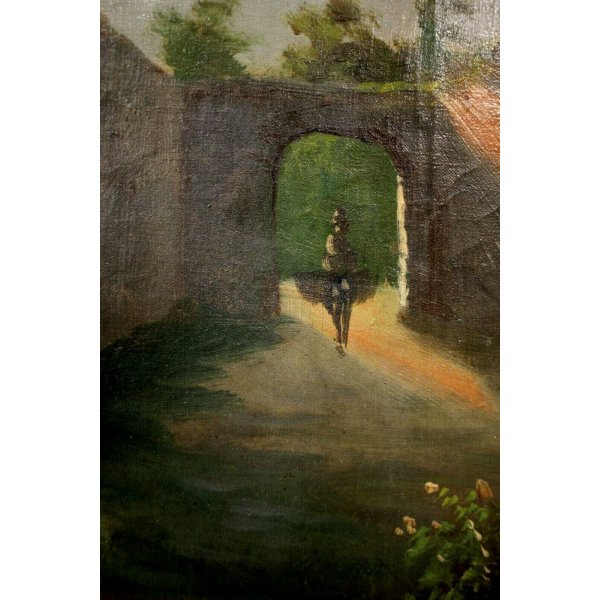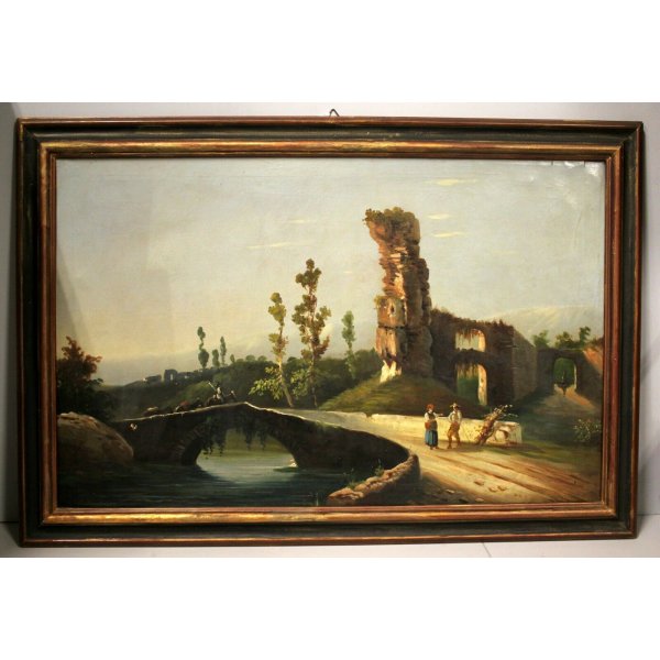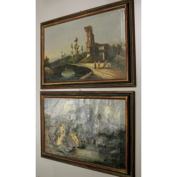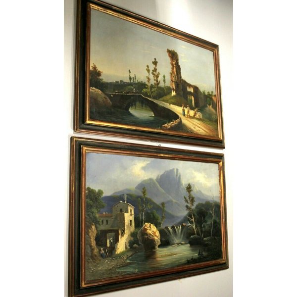 Magnifica coppia di antichi dipinti di grandi dimensioni, realizzati ad olio su tela, opere rappresentanti vedute senza tempo, finestre sul passsato, rigogliosi paesaggi classici di campagna toscana o laziale con corsi d'acqua, casali, ponti e antichi ruderi architettonici che si innalzno nella vegetazione come quinte teatrali che guidano la prospettiva verso l'orizzonte. In primo piano alcune minute figure intente al loro lavoro o a passeggiare. Le opere non presentano firma e sono contenute cornici lignee, lineari dai colori scuri lumeggiate oro con profilo sui toni del rosso. I dipinti sono antichi, frontalmente traspare leggermente il telaio, la tela presenta segni del tempo sui bordi ed è un po' lasca, presentano pregressi interventi di restauro. Particolari che nell'insieme non compromettono la bellezza delle opere. Tutto visibile dalle foto allegate all'inserzione. Dipinti incantevoli, unici, capaci di valorizzare gli ambienti con originalità e carattere.
