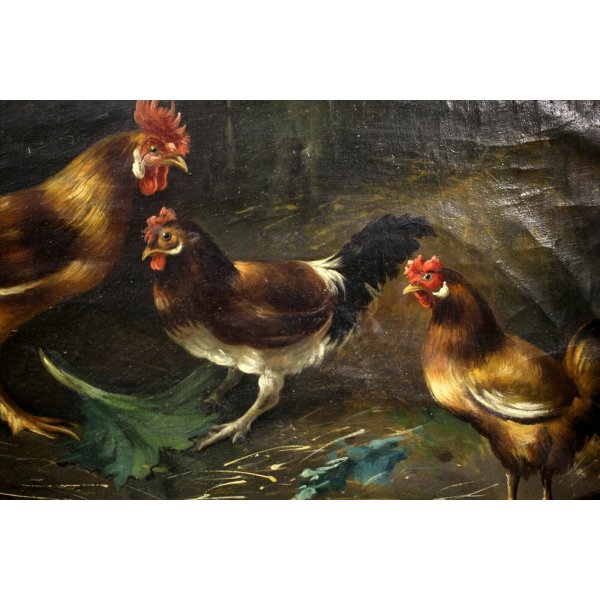 Meraviglioso antico dipinto olio su tela rappresentatnte una scena di vita contadina, un pollaio con galli e galline. L'opera di ottima fattura è firmata in basso al centro "R.Tito" ed è contenuta in una cornice importante, ornata con tema vegetale in foglie d' acanto, gessata e dorata.