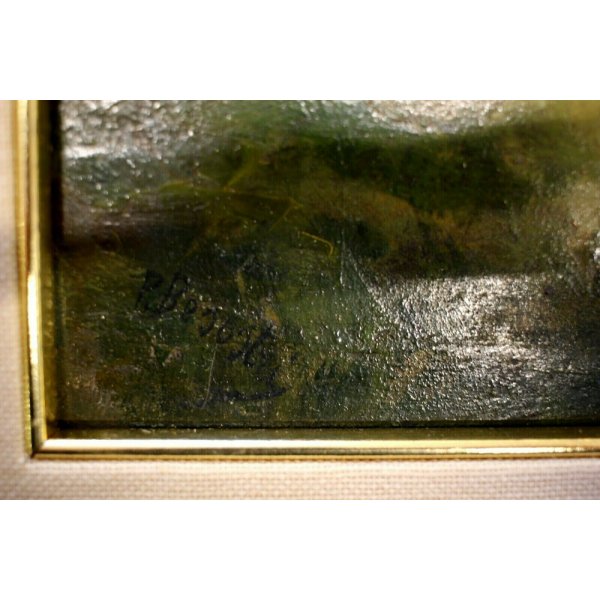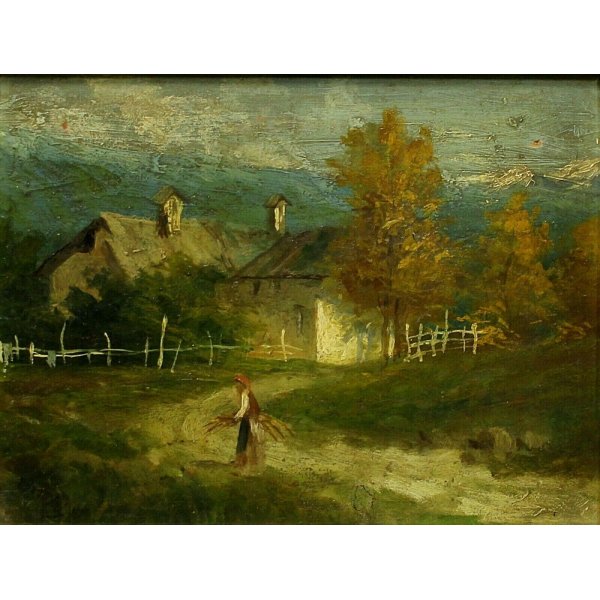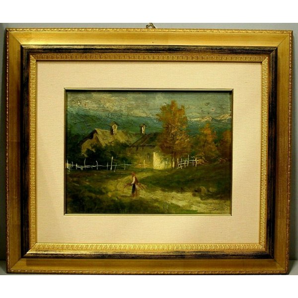 Suggestivo dipinto olio su tavola rappresentante la veduta di un paesaggio montano con le tinte verdi, brune e i bruciati del foliage autunnale. Una scena di vita rurale: in primo piano una contadina raccoglie sulla strada di casa un fascio di fieno, sullo sfondo due baite si affacciano sulla valle ed in lontananza spiccano le bianche vette innevate. L'opera è firmata frontalmente in basso a sinistra "Pietro Besostri" e al verso è presente un autografo . Dipinto di ottima fattura contenuto in una elegante cornice lignea ornata e dorata con un profilo scuro e passepartout in tela grezza non coeva.