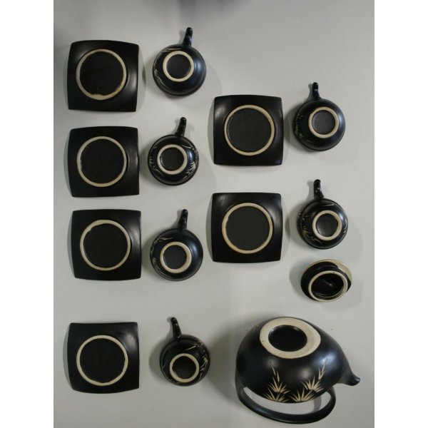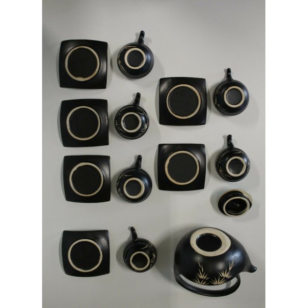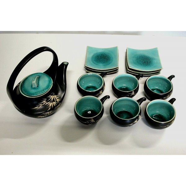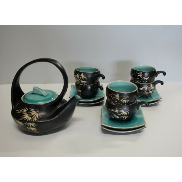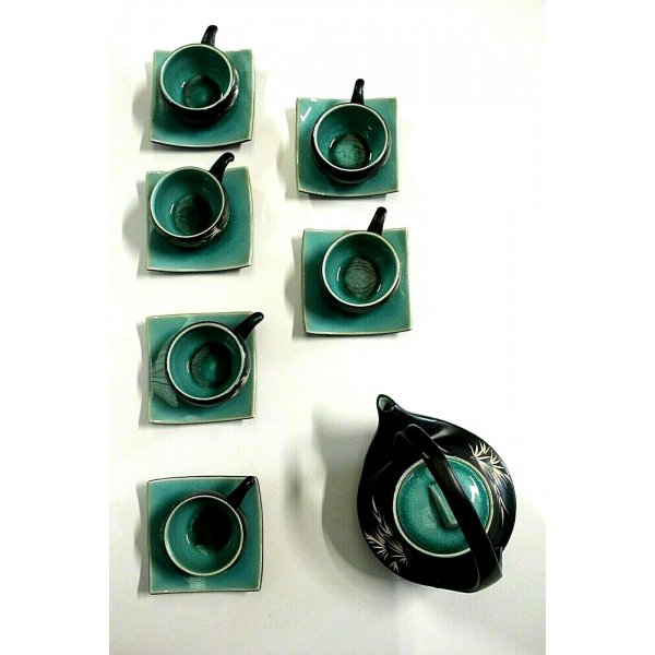 Antico e raffinato, servizio da the Japponese per 6 persone, realizzato in ceramica gres nero con decoro fogliato color ecrù e interno smaltato effetto craclé, verde acqua. La forma delle tazzine è tondeggiante con presa a goccia, i piattini sono quadrati. Servizio vintage in ottime condizioni conservative, completo di teiera .