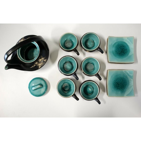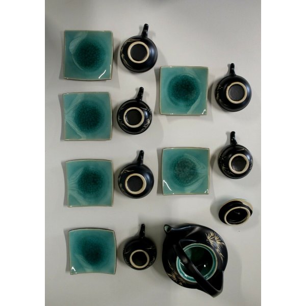 SERVIZIO TE' 6pers Giapponese CERAMICA GRES NERO SMALTO VERDE CRACLE' DESIGN