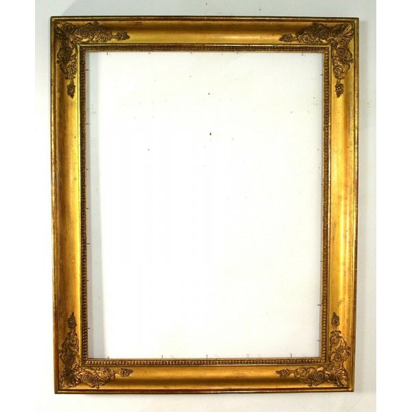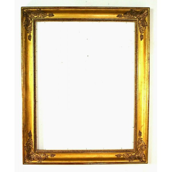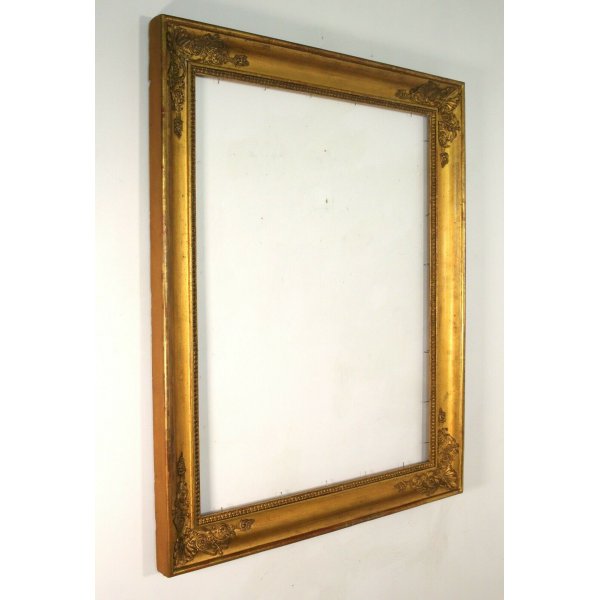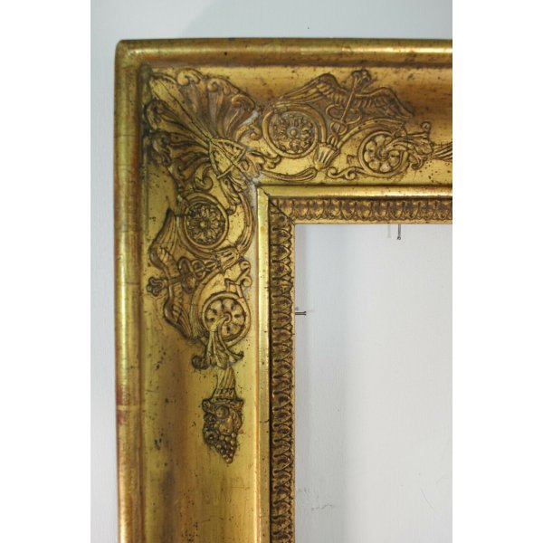 Stupenda antica cornice in legno scolpito gessato e dorato, fine '800 primo '900, decoro in forma di cornucopie fiori frutta, bastone alato con due serpenti attorcigliati intorno a esso (probabilmente, un bastone caduceo, simbolo di pace e prosperità, associato al dio greco Ermes), scudi e foglie d'acanto.