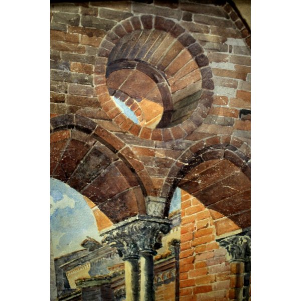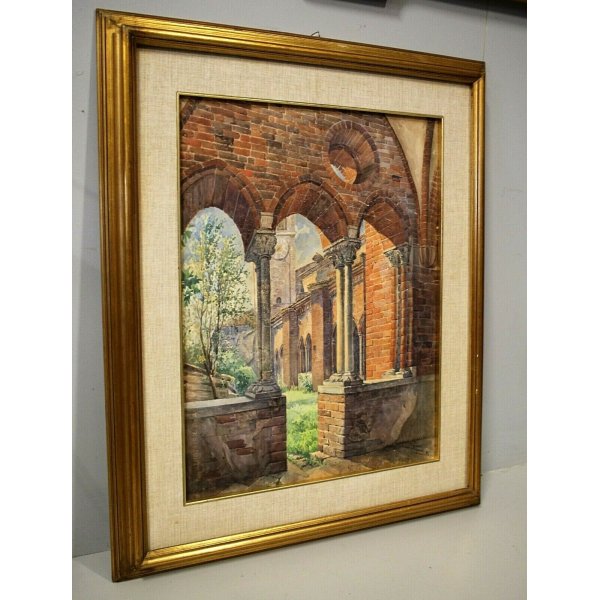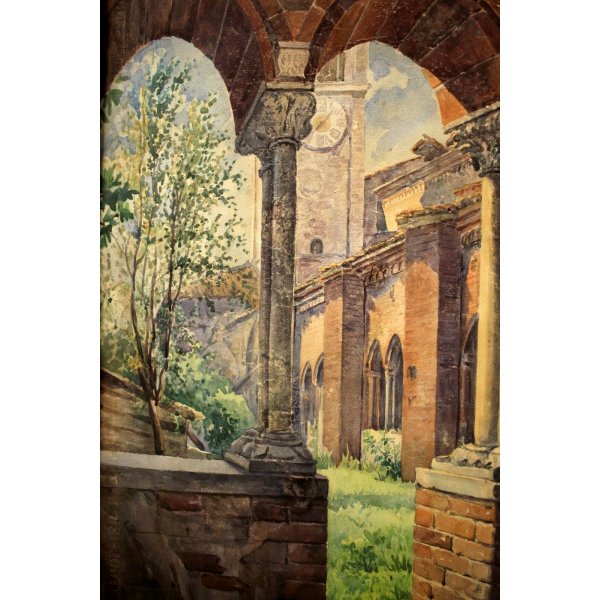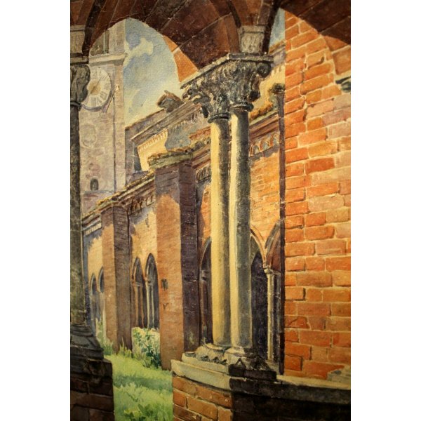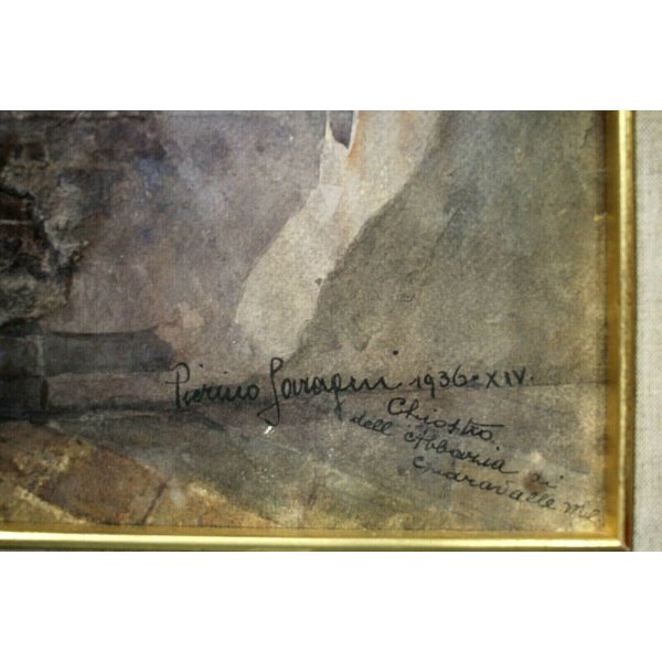 Stupendo acquerello, opera di Pierino Saragni firmata, datata e titolata in basso a destra. rappresentante uno scorcio del chiostro dell'abbazia di Chiaravalle complesso monastico cistercense situato nel Parco agricolo Sud Milano, tra il quartiere Vigentino e il quartiere Rogoredo. Fondata nel XII secolo da san Bernardo di Chiaravalle. La chiesa costituisce uno dei primi esempi di architettura gotica in Italia. Pierino Saragni artista noto anche per essere stato soldato in prigionia nella guerra d'Africa e nel dopoguerra pittore e autore di vetrate artistiche soprattutto per chiese, nonché cavaliere del lavoro per meriti artistici