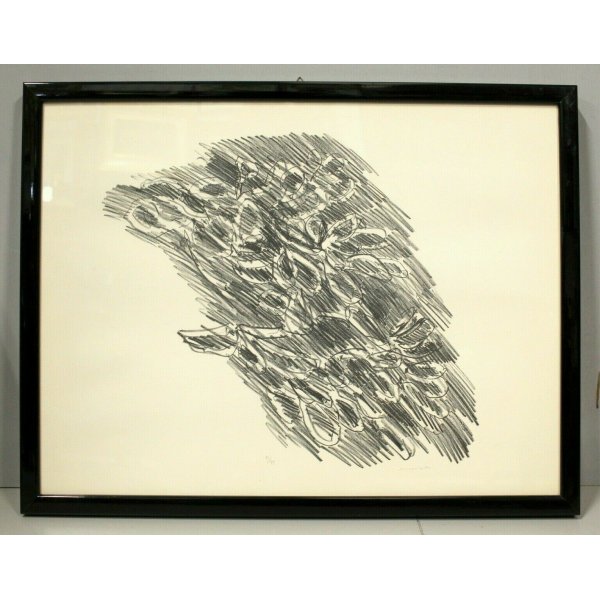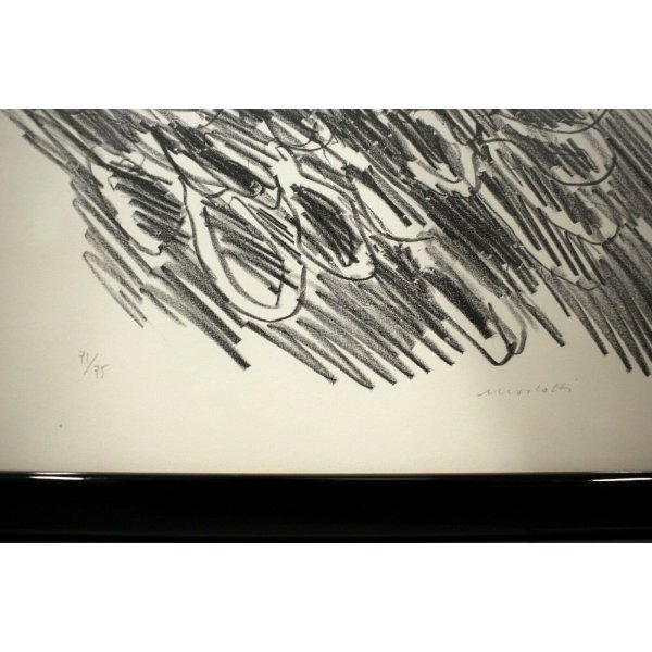 Stupenda litografia, stampa multiplo con soggetto astratto, opera di Morlotti Ennio, senza titolo. Anteriormente è presente la firma autografa dell’artista e la numerazione della copia su numero di tiratura complessiva a grafite: 71/75 - Morlotti, artista quotato e presente in asta. L'opera è contenuta in una cornice lineare in legno laccato nero lucido con vetro protettivo.