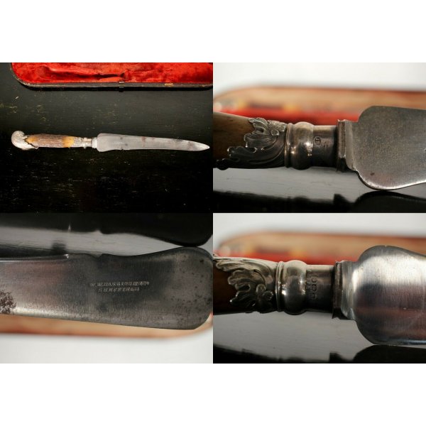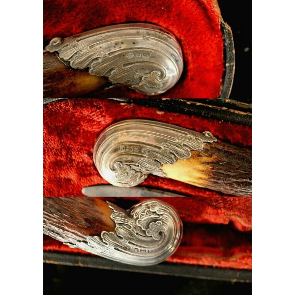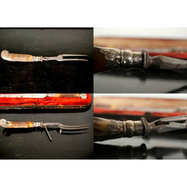 Fantastico antico set Vittoriano di servizio per arrosto, composto da 3 pezzi con manico in corno e rinforzo in metallo argentato e punzonato (vedi foto allegate), splendidamente incisi con il design del fogliame vittoriano. La lama del coltello è argentata e presenta il marchio d'attribuzione del produttore: W.W. Harrison & co Sheffield argenteria inglese Vittoriana, risalgono alla seconda metà del XIX secolo. Il set è contenuto in una elegante custiodia internamente rivestita in velluto rosso. Magnifico per rendere qualsiasi evento o pasto un po' più speciale.