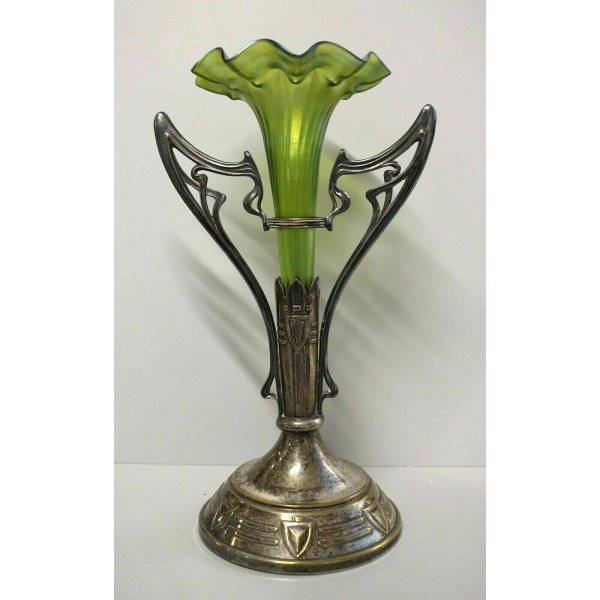 Meraviglioso e antico vaso Liberty, realizzato in vetro di bohemia soffiato a mano. Composto da una struttura in ottone argentato, contenente un vaso in vetro verde con sfumature iridescenti di ossido d'argento, affusolato rigato terminante con una bocca dalla forma mossa a tromba. Il vaso non presenta firma, per design e fattura è riferibile ad una produzione Loetz del primo '900.