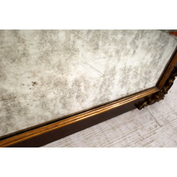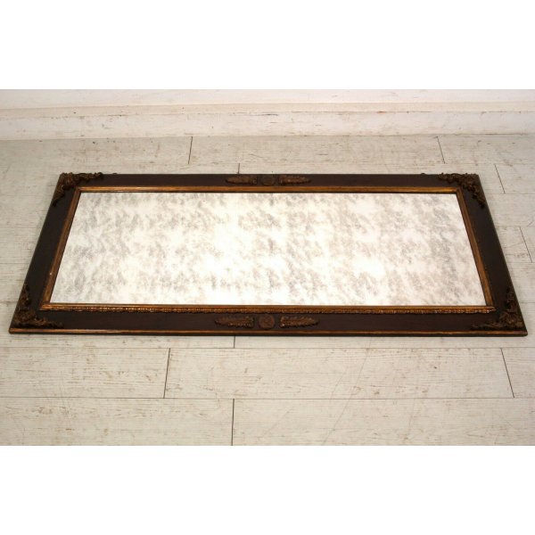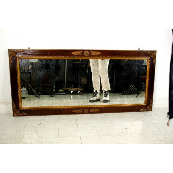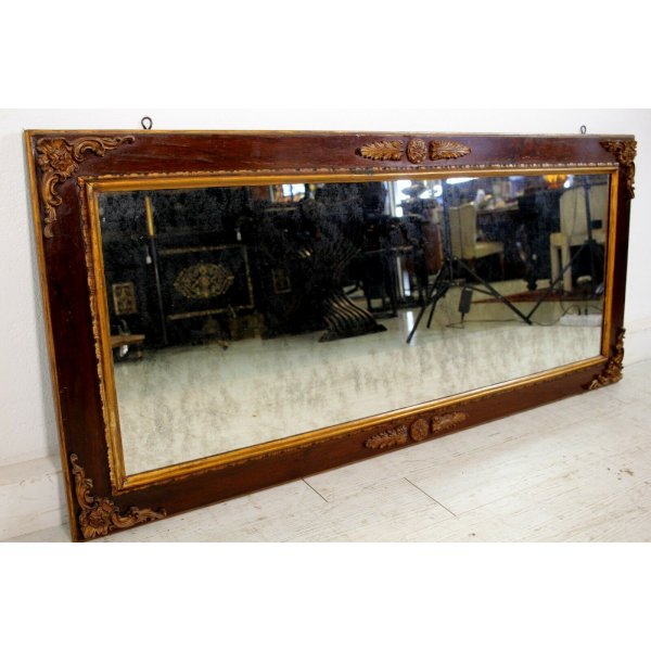 Stupenda specchiera da parete, da appendere o d'appoggio rettangolare, in legno di abete massello, il suo bordo è decorato con inserti dorati con porporina, ornato a tema naturale in foglie e fiori d'acanto. Lo specchio è contornato da una corince stondata con profilo scolpito e dorato, non coevo ed anticato, in buone condizioni conservative.