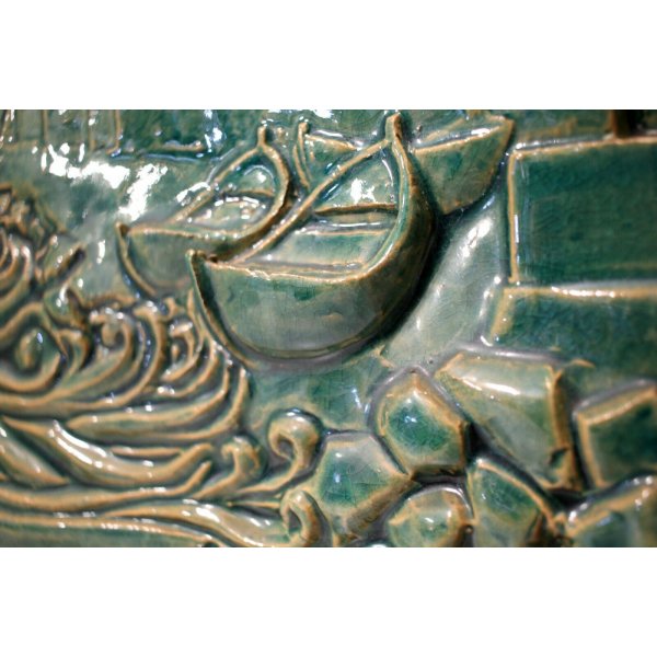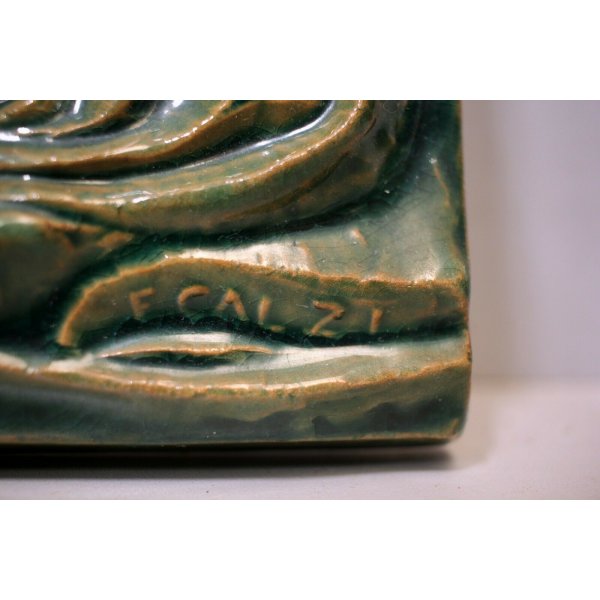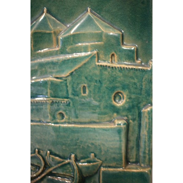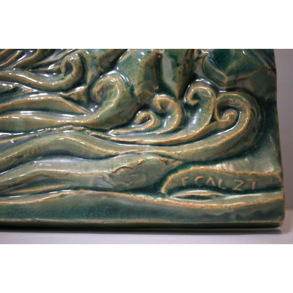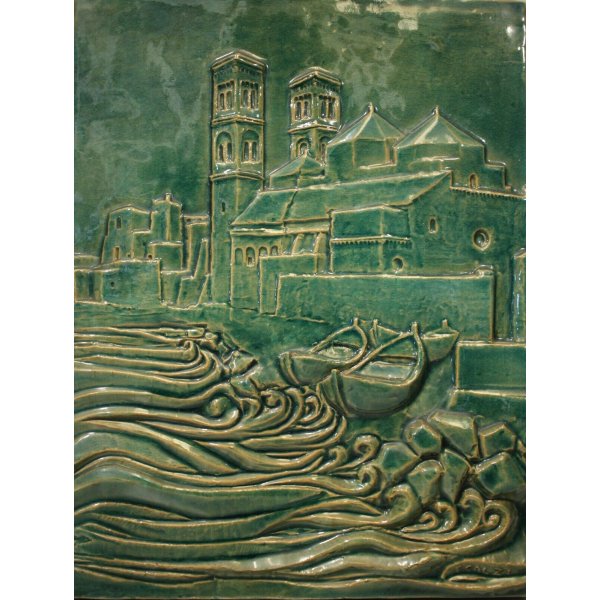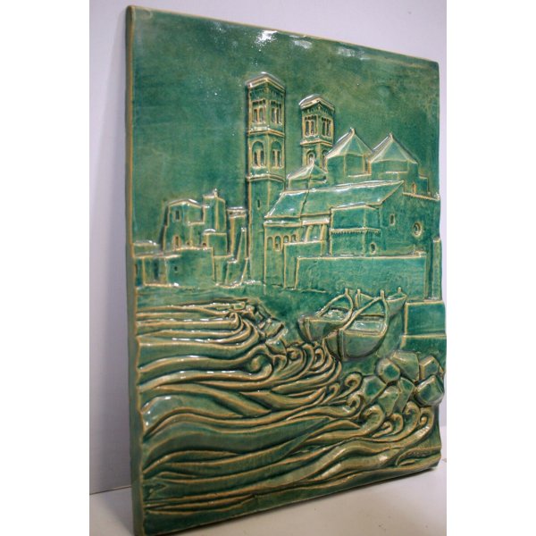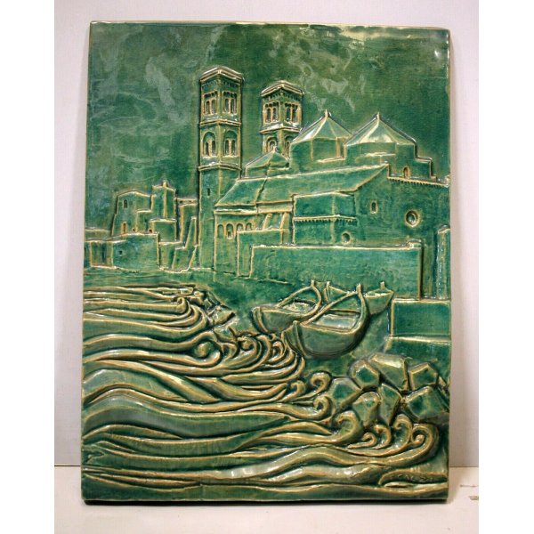 Meravigliosa formella, bassorilievo. Scultura in ceramica smaltata color verde, rappresentante la veduta del duomo di Molfetta, vista dal mare. La struttura è formata da tre cupole in asse e due torri, l’una campanaria e l’altra d’avvistamento che guarda il mare. L'opera, di eccelsa fattura è in ottime condizioni conservative ed è firmata in basso a destra tra le onde "F. Calzi" noto ceramista Faentino, trasferitosi a Bari negli anni '50.