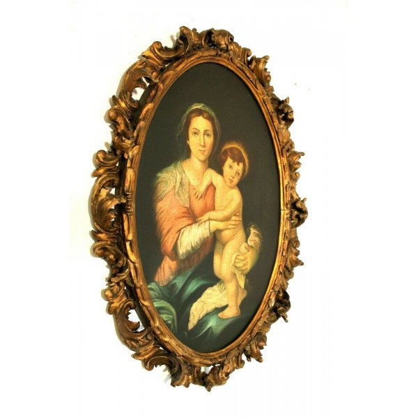 Antico dipinto ovale, olio su tela applicata su tavola, raffigurante la Madonna con Gesù Bambino in braccio. Maria è raffigurata a mezzo busto nell'atto di reggere sulle sue gambe Gesù, tenendolo tra le braccia per proteggerlo. L'opera è contenuta in una meravigliosa cornice lignea ornata e dorata con motivo roccoco' in forma di foglie d'acanto accartocciate.