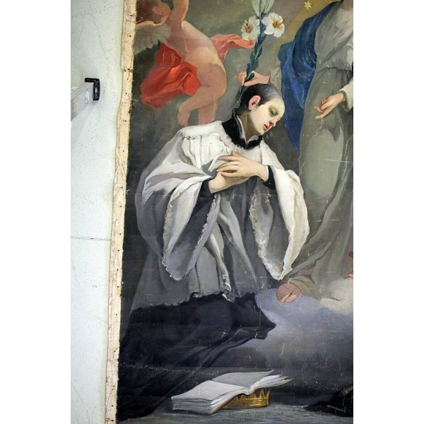 Antico grande dipinto olio su tela. L'opera ha soggetto religioso, si presenta senza telaio, arrotolata. La scena si svolge in uno spazio aperto con drappi tenuti da un putto, la disposizione triangolare dei personaggi, conferisce stabilità ed ordine alla scena che è caratterizzata dall'utilizzo di colori tenui e da una particolare luminosità delle figure che si nota nell'incarnato, nelle vesti. Osservando gli attributi iconografici, i soggetti rappresentati si riconoscono: Maria con sette stelle (sette allegrezze?), il Padre Eterno con la colomba dello Spirito Santo irraggia il volto di Maria che tiene nella mano destra un giglio, simbolo di purezza, San Rocco con il cane e San Luigi Gonzaga con la corona sotto il libro. Zapelloni (1877-1961) è stato un noto artista, architetto, scultore, pittore piemontese, attivo a Stresa (Lago Maggiore) tra la fine dell' '800 e il primo '900, quotato e presente in asta.