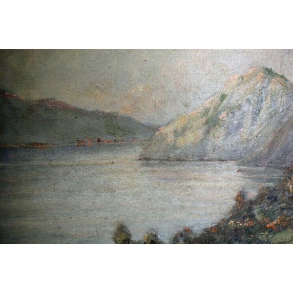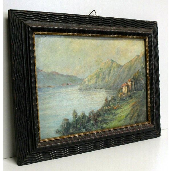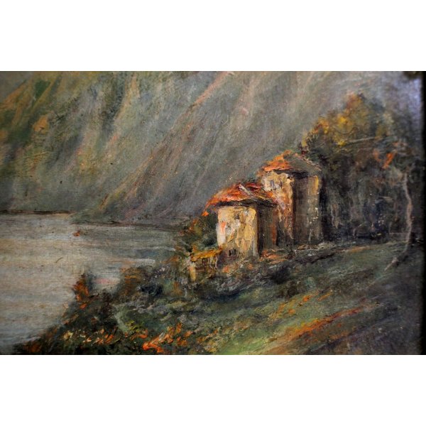 Stupendo piccolo dipinto ottocentesco, olio su cartone, rappresentante un paesaggio montano con un piccolo borgo affacciato sul lago, contornato da prati fioriti al quale le montagne fanno da sfondo. Notevole tecnica dalle pennellate corpose e decise e composizione di grande profondità. L'opera non presenta firma ed è contenuta in una elegante cornice Guilloché con profilo interno dorato.