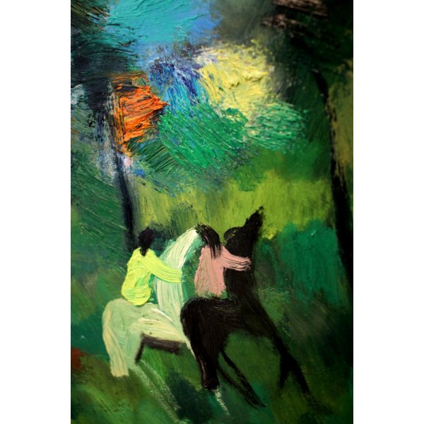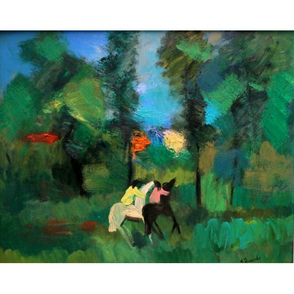 Suggestivo dipinto astratto. Opera di eccezionale qualità, rappresentante una cavalcata nel bosco. Le figure sono immerse nelle luci della sera in una atmosfera da sogno, rivolte verso il bosco, la loro posizione vista da dietro ci consente di ammirare la vastità del paesaggio e dona profondità alla composizione, descritta colori intensi, brillanti stesi con pennellate corpose, decise. Disegno firmato e datato in basso a destra "d'Accardi", noto artista siciliano, nato a Palermo nel 1906, quotato e presente in asta.