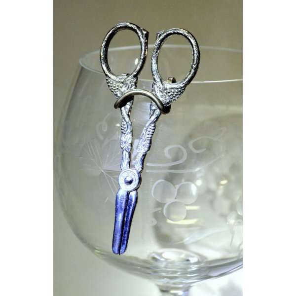 Ø TITOLO: Stupende forbici da uva con coppa, originali d'epoca, di altissima qualità, produzione Danese, Hans Jensen, bicchiere-coppa in cristallo molato a mano.
