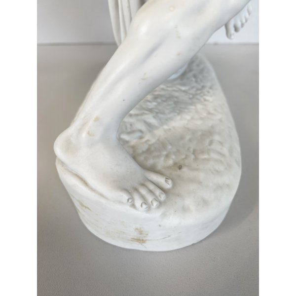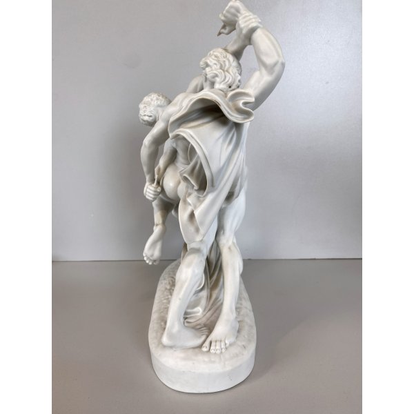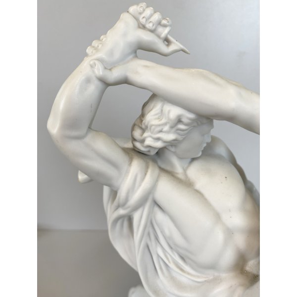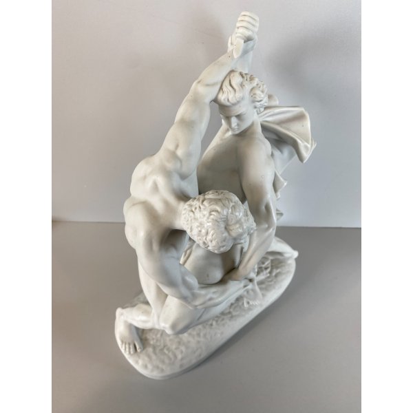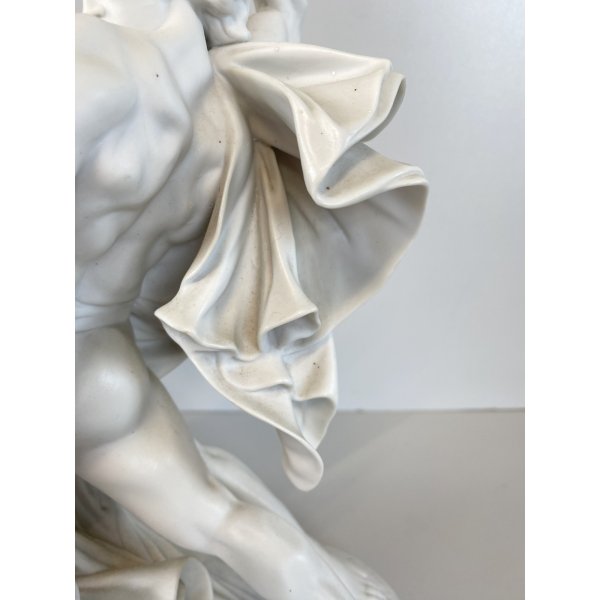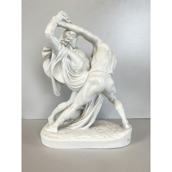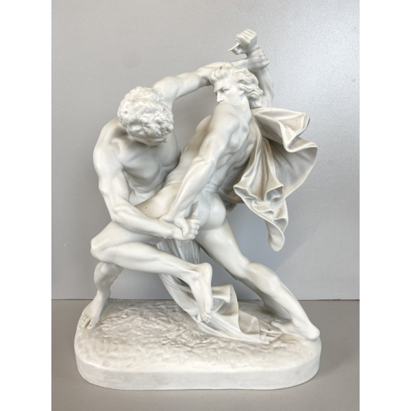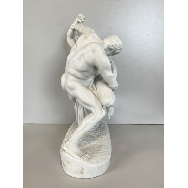 Stupenda scultura in porcellana bianca biscuit. L' opera riproduce la scultura creata dall'artista svedese Johan Peter Molin nella metà del XIX nello stile del nazionalismo romantico, rappresentante due Lottatori di coltelli - Bältesspännare - Knife wrestler - Messer Wrestlers. Di ottima esecuzione e in ottime condizioni conservative, presenta impresso sul basamento il marchio composto da due spade incrociate e il numero "1260/99" attribuibile ad una produzione di una manifattura di Porcellane di Dresda. Non sono un'esperta il marchio è di difficile interpretazione.