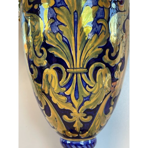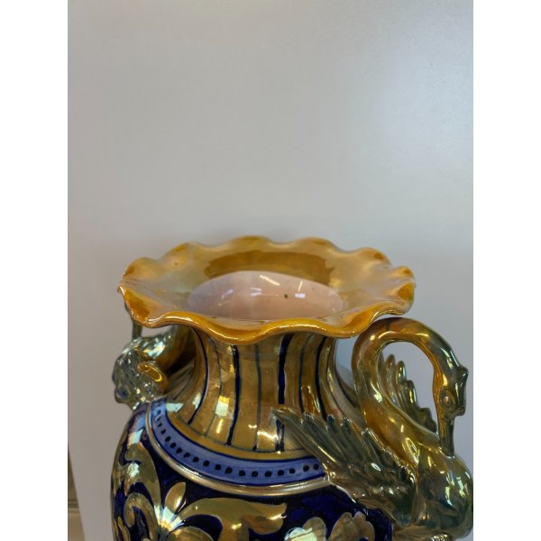 Incantevole, vaso con anse in ceramica maiolica con finitura a lustro di Gualdo Tadino firmato sulla base "Gualdo Tadino", risalente alla prima metà del XX secolo. Presenta due anse modellate con figure di cigni, decoro raffaellesco con riserve contornate da motivi sfogliati e draghi alati. In buone condizioni, visibili dalle fotografie allegate.