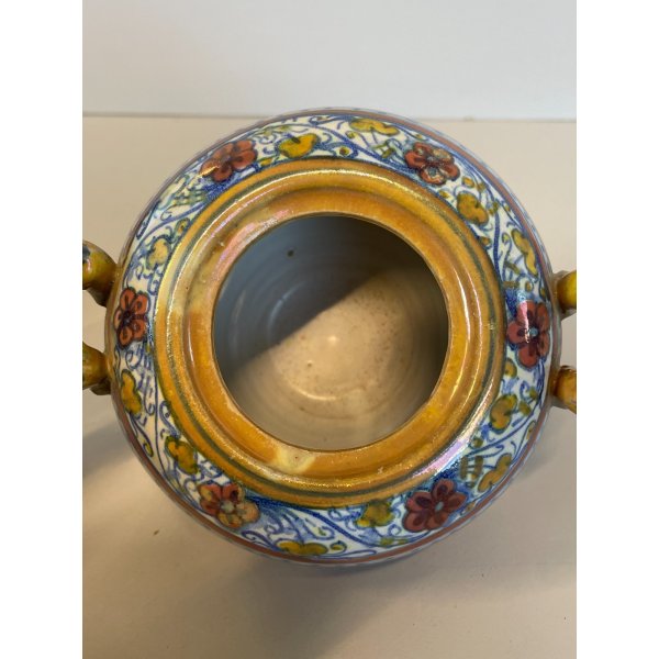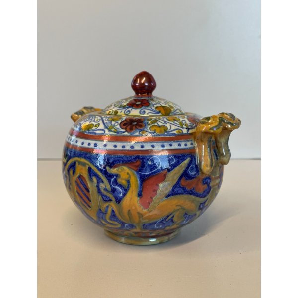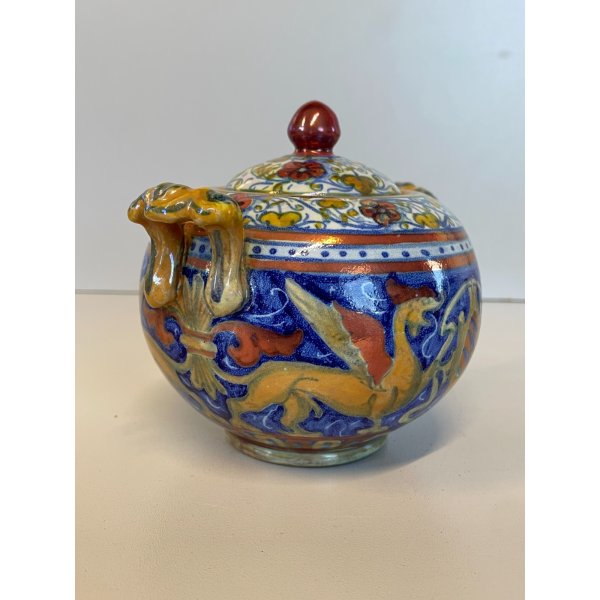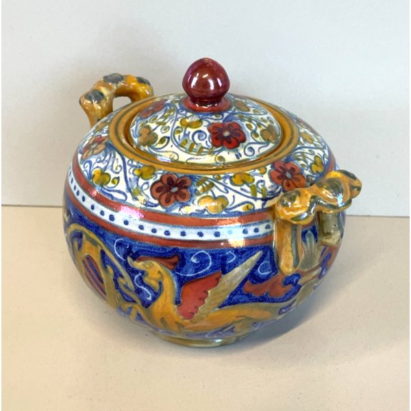 Incantevole teiera zuccheriera con anse in ceramica maiolica con finitura a lustro di Gualdo Tadino firmato sulla base "Gualdo Tadino", risalente alla prima metà del XX secolo. Presenta due anse modellate, decoro raffaellesco con riserve contornate da motivi sfogliati e draghi alati. In buonissimi condizioni, visibili dalle fotografie allegate.