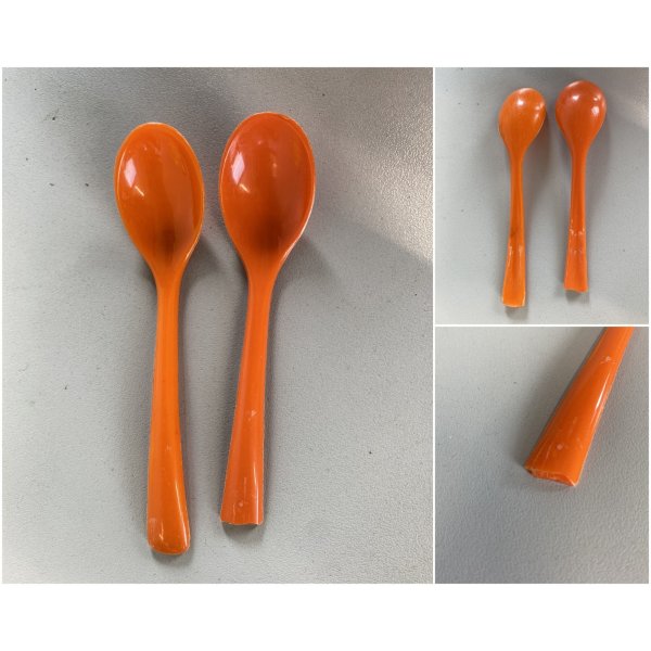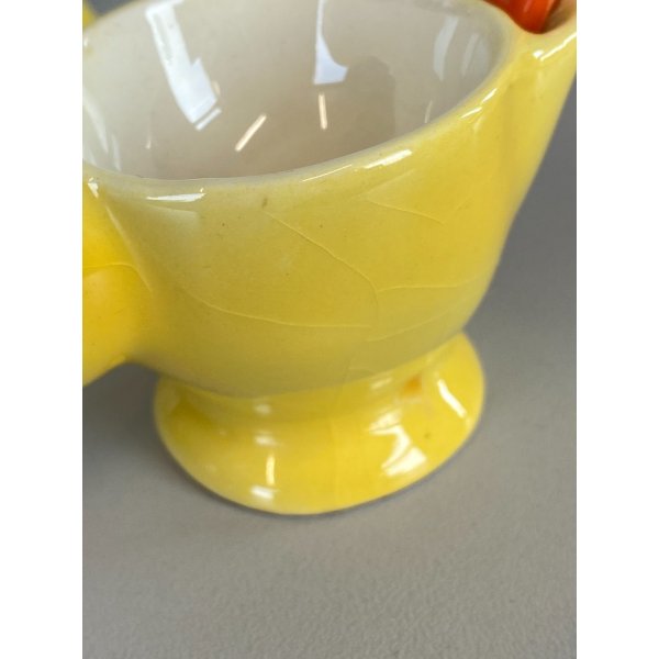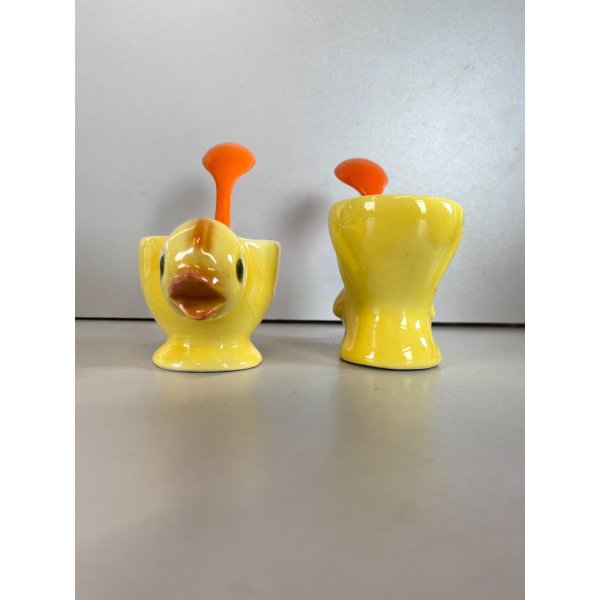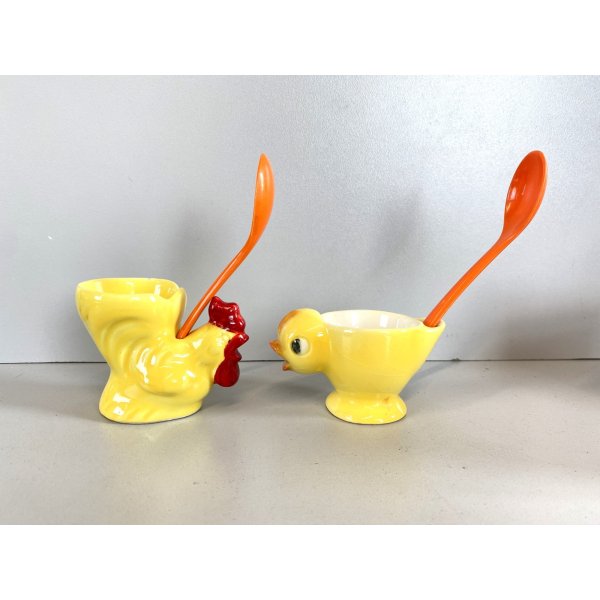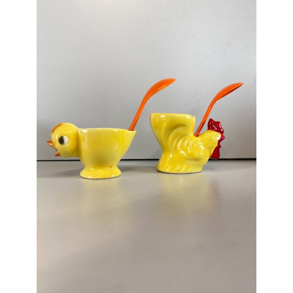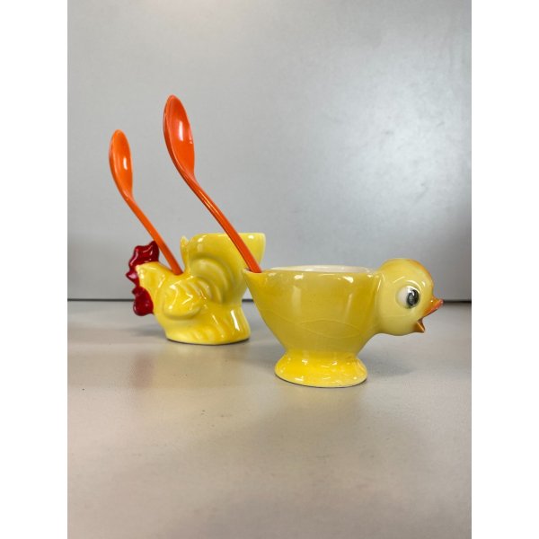 Stupenda coppia di portauova vintage "Goebel", prodotti in Germania Ovest, completi di cucchiaini in plastica arancione originali, uno mancante un pezzetto di manico, segnalo 2 piccole sbeccature sul profilo del portauovo a forma di gallina (marchio impresso sulla base E67) e leggero craclé dello smalto sul pulcino.