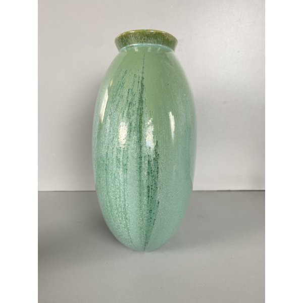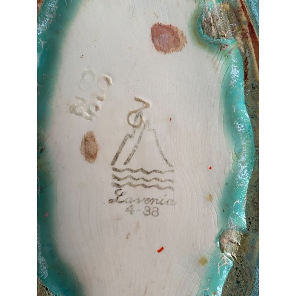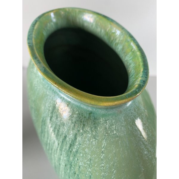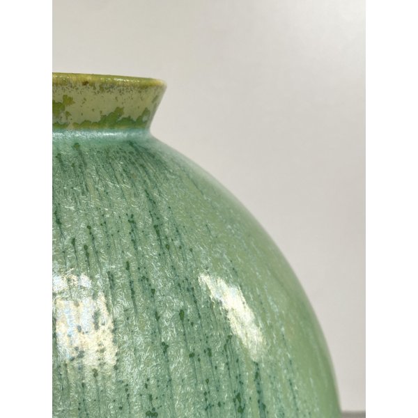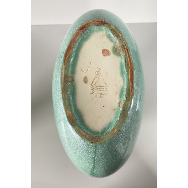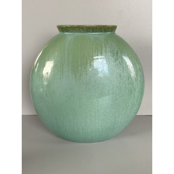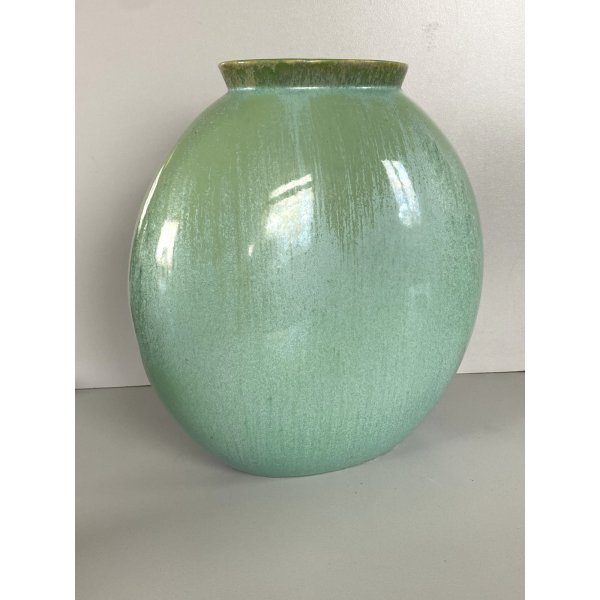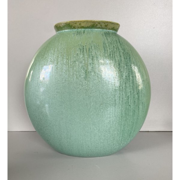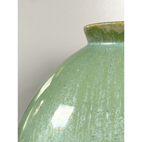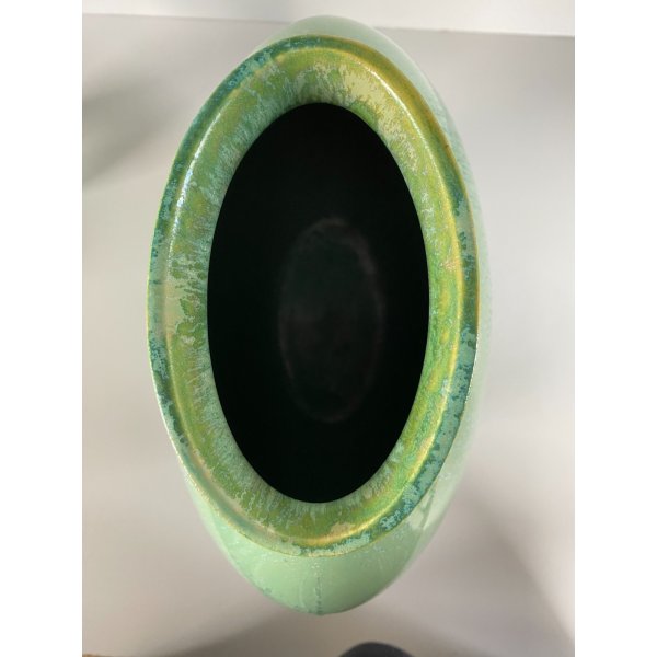 Splendido vaso dalla forma rotonda schiacciata a "lente", in ceramica smaltata a colaggio nei toni del verde. Marchio della manifattura sulla base in verde sotto smalto "Lavenia 4-38" impresso in pasta: 32/38 (?di difficile lettura). Mod. "1316" disegnato da Guido Andloviz negli anni '30. Segnalo leggeri segni del tempo e di utilizzo compatibili con l'epoca. Tutto visibile dalle fotografie allegate all'inserzione