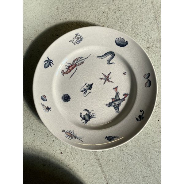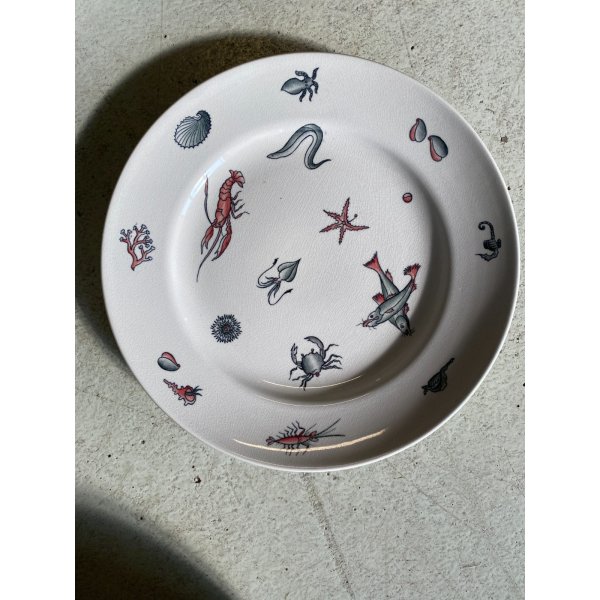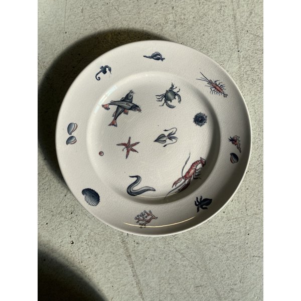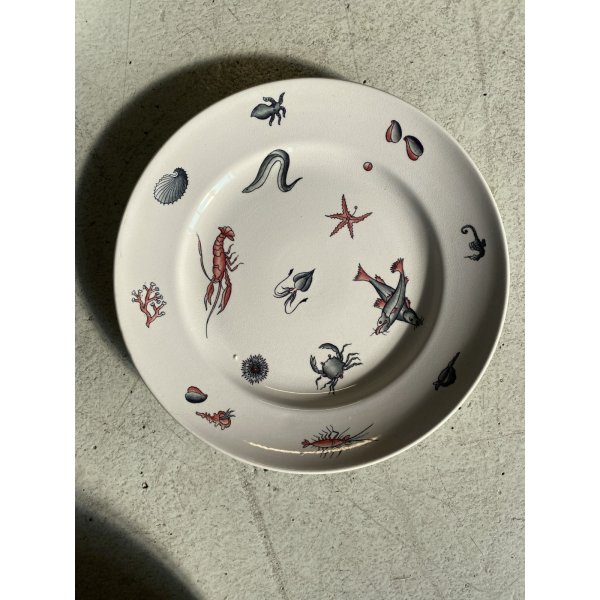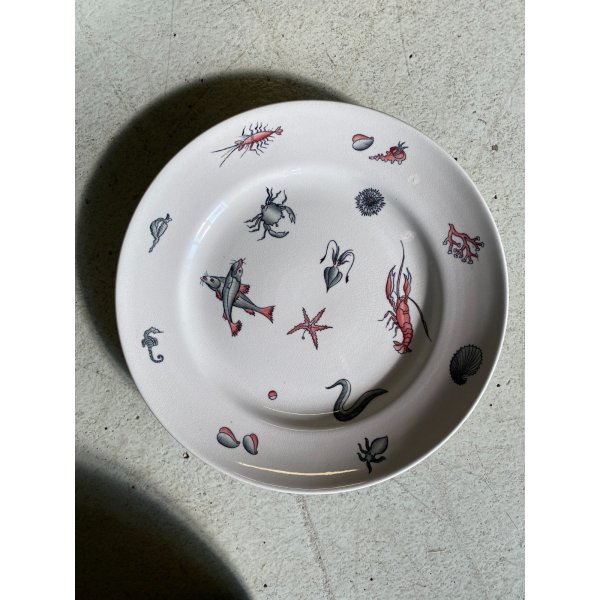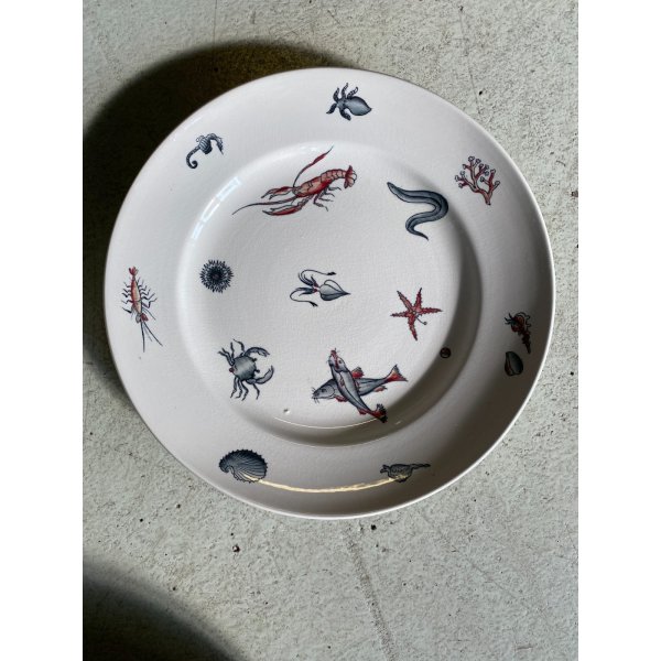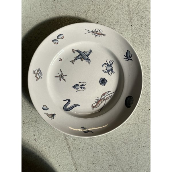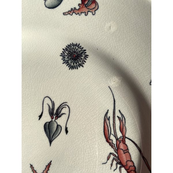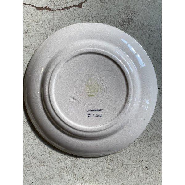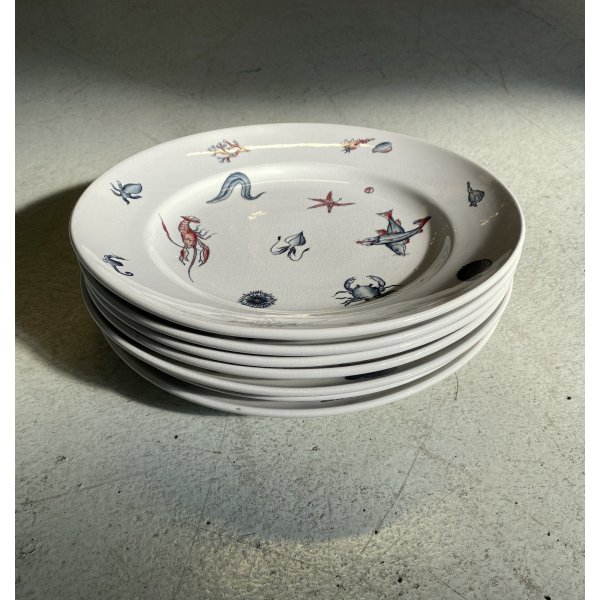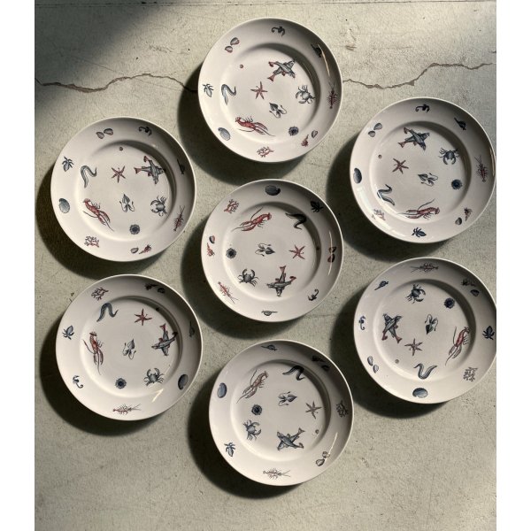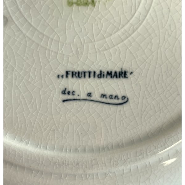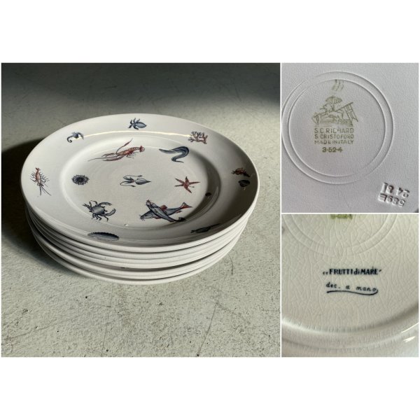 Meraviglioso, introvabile, servizio di piatti da pesce per 7 persone, design mid-century, in ceramica bianca, decorati a mano con tema "Frutti di mare", prodotto da S.C. Richard S. Cristoforo negli anni '50, marchio in verde sotto smalto su ogni pezzo con nome del decoro in blu e 589 - 248 impresso in pasta. Il servizio si distingue per la sua raffinatezza e per la freschezza del decoro che conferiscono a questo servizio un fascino intramontabile. Prodotto negli anni '30 servizio di grande valore storico e artistico, ricercato da collezione.