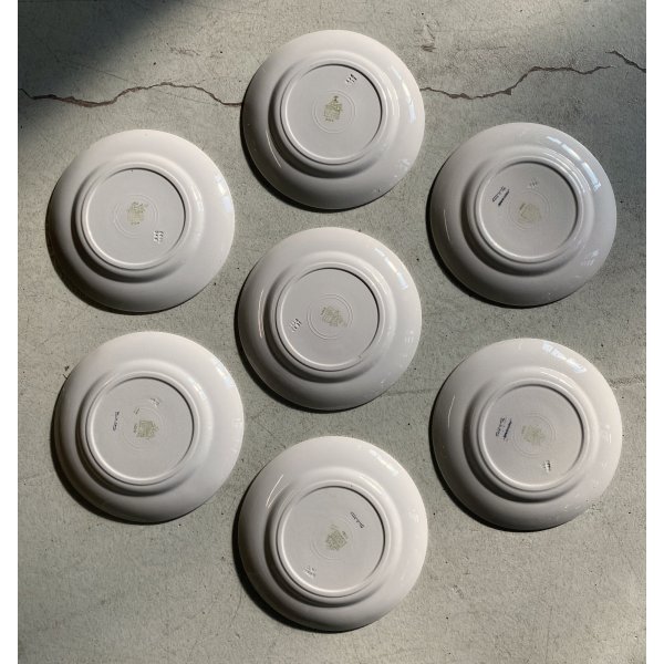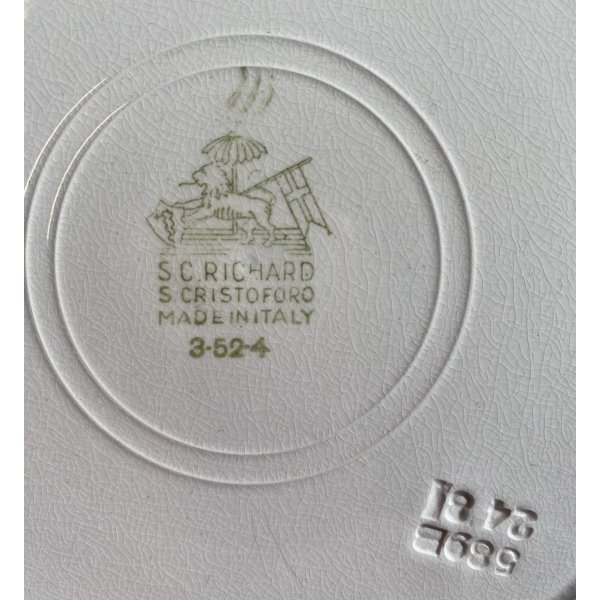 Manifattura: S.C. Richard - Marchio in verde sotto smalto su ogni pezzo - scritta : S. C. RICHARD sormontata da un leone di profilo sinistro che tiene fra le zampe anteriori uno scudo con un serpente, mentre con la coda regge un vessillo crociato; al suo fianco una margherita. nome del decoro in blu (su 4 piatti)
