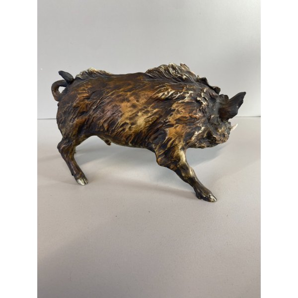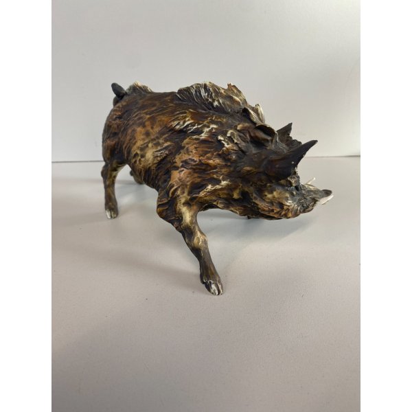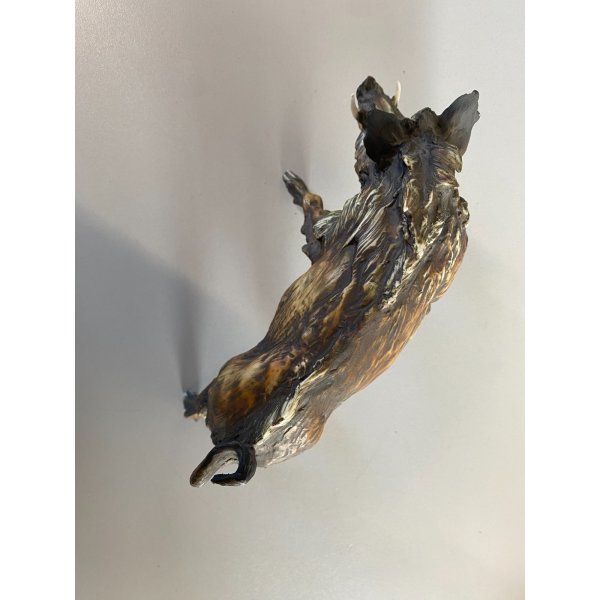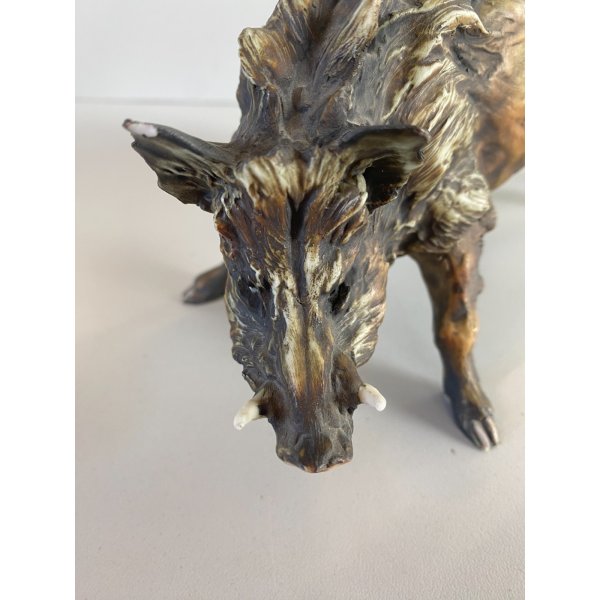 Stupenda scultura rappresentante un cinghiale in posizione dinamica, realizzato in porcellana biscuit, descritto con grande realismo, cura e abilità artigianale. Dipinto a mano con colori scuri dalle sfumature brune e arancioni, ed una elegante finitura opaca. In buone condizioni conservative, segnalo un piccola sbeccatura sull'orecchio destro, tutto visibile dalle fotografie allegate all'inserzione. Opera di ottima fattura, molto espressivo, realizzato intorno alla metà del '900, non presenta marchio d'attribuzione. Dimensioni: 19x10,5 cm/h