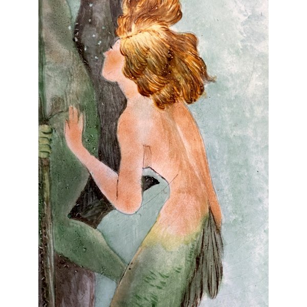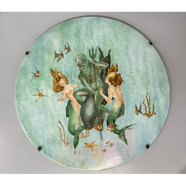 Meraviglioso piatto da parete (ø 41cm), decorativo in ceramica smaltata decorato in policromia con una scena mitologica marina, raffigurante Nettuno con in mano un tridente a cavallo di un tritone, circondato da due sirene. Scena intitolata "Il mito di Nettuno" dipinto firmato in basso a destra sotto alla coda della sirena dall'artista "Liliana"