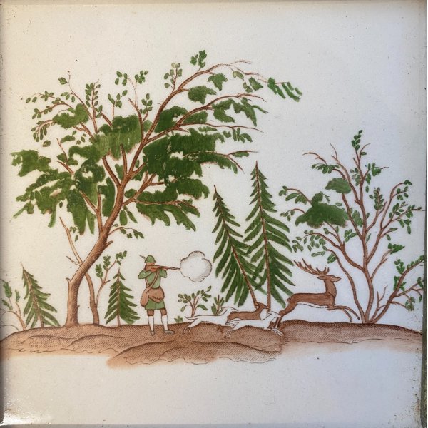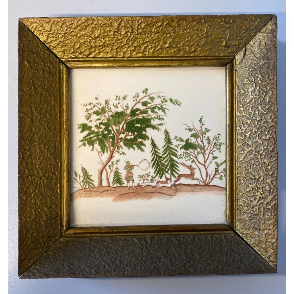 Meravigliosa coppia di formella, piastrella in ceramica smaltata decorata a mano in policromia con una scena di caccia su sfondo naturale boschivo con arbusti: Caccia al cervo. Prodotte negli anni '20 / '30 Marcate al verso (S.C.I.) di Laveno 15 x 15 cm, contenute in una cornice lignea, coeva, di grande spessore