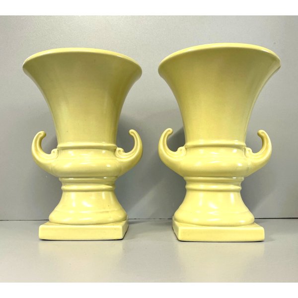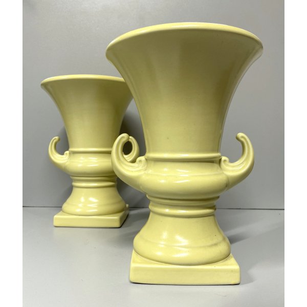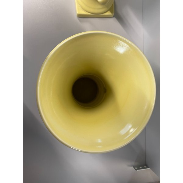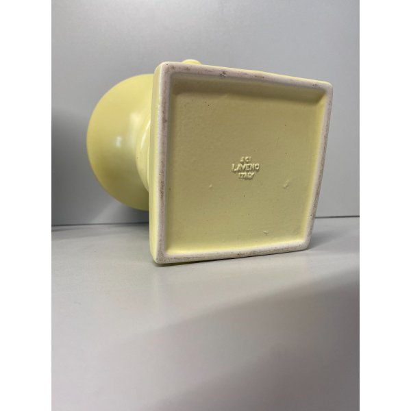 Stupenda coppia di vaso, coppa con manici e base quadrata disegnati da Antonia Campi nel 1956/57 per manifattura S.C.I. Laveno Italy, realizzato in terraglia forte, formatura a colaggio, smalto giallo sotto vetrina. Impresso sul fondo si trova il marchio di attribuzione. Dimensioni 22 x 16 cm circa. In ottimo stato di conservazione