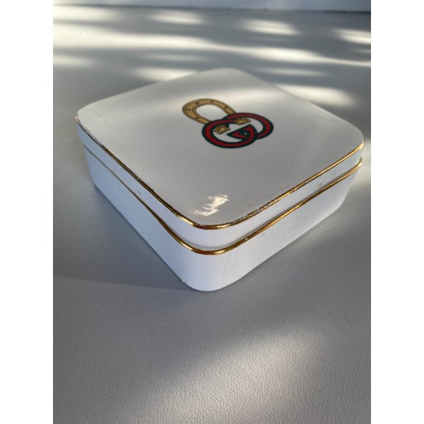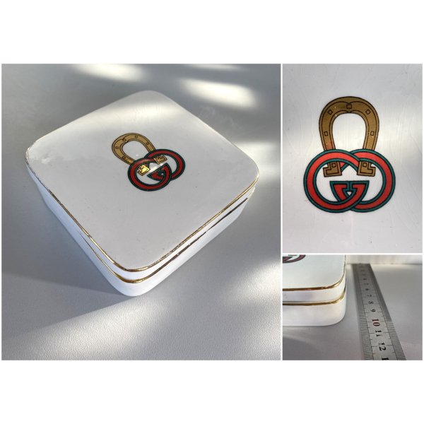 Fantastica scatola vintage con coperchio, portagioie in ceramica sul quale è visibile il logo Gucci, realizzata negli anni '70. Forma quadrata e angoli arrotondati, decorata con tema equestre su sfondo bianco, profilata in oro zecchino "Made in Italy" sulla base. Usata con segni del tempo come: usura del profilo dorato, uniforme craclé dello smalto e leggeri aloni. Visibile dalle fotografie allegate all'inserzione.