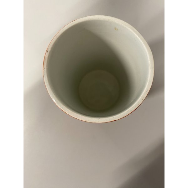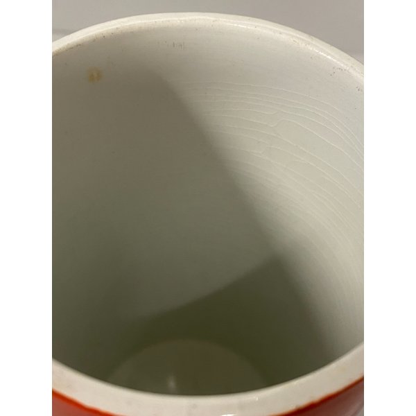 Stupendo vaso caratterizzato da una forma essenziale e funzionale. Un cilindro in ceramica bianca, esternamente smaltato in monocromia arancione/rosso corallo. Prodotto da Richard Ginori negli anni '50/'60. Con dimensioni: ø 8 x15,5 cm/h. Sotto la base: due tipi di marchio Richard Ginori. Uno con: leone, scudo, bandiera e margherita, in verde sotto smalto. L'altro "Magazzini Ginori - Milano Via Dante" inscritto in ovale con corona in rosso scuro sotto smalto.